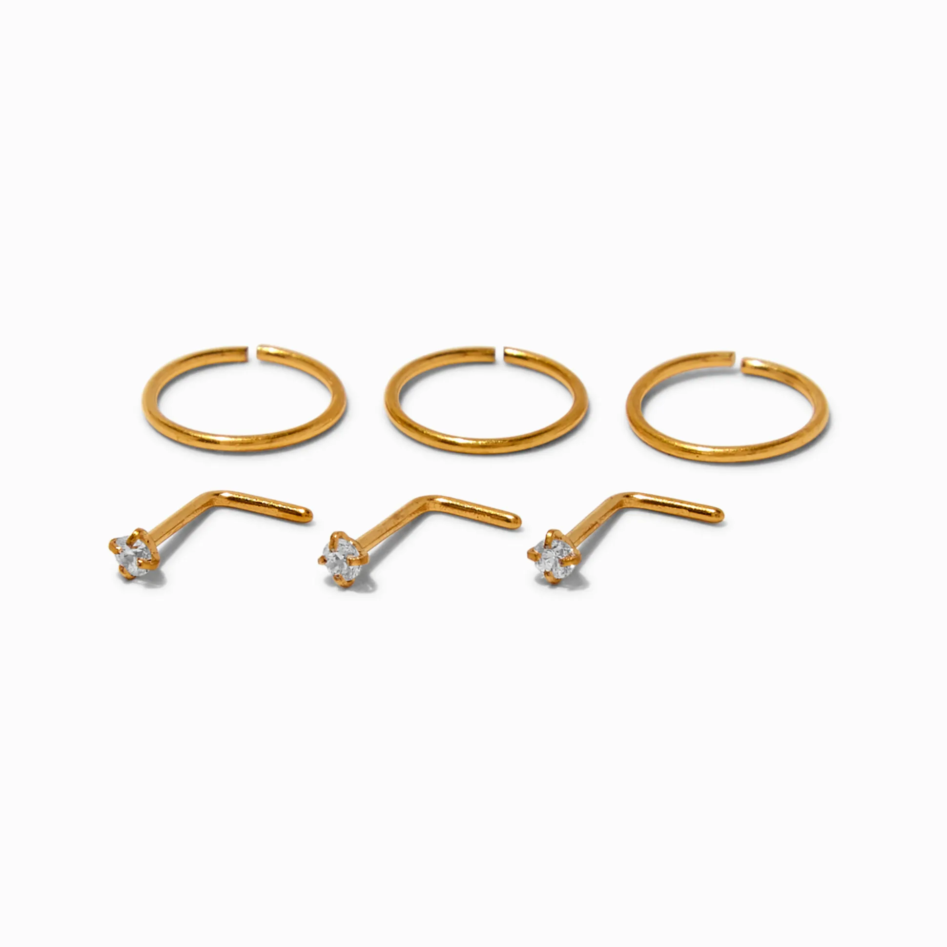 Expand your nose jewellery collection with this stunning six pack. It includes three studs with cubic zirconia stones and three plain hoops, made out of durable gold-tone titanium.