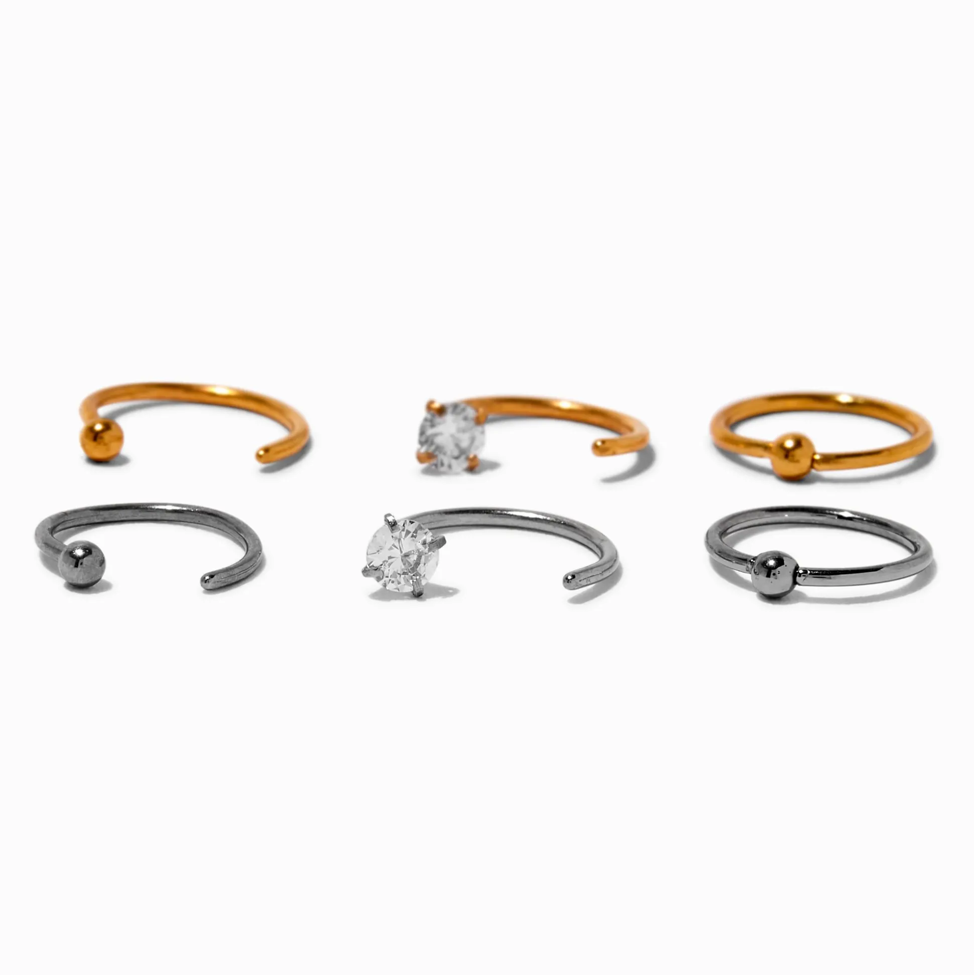 Élargis ta collection de bijoux pour piercing de nez avec cet incroyable lot de six. Il comprend trois anneaux couleur argentée et trois anneaux couleur dorée avec des détails en zircon cubique.