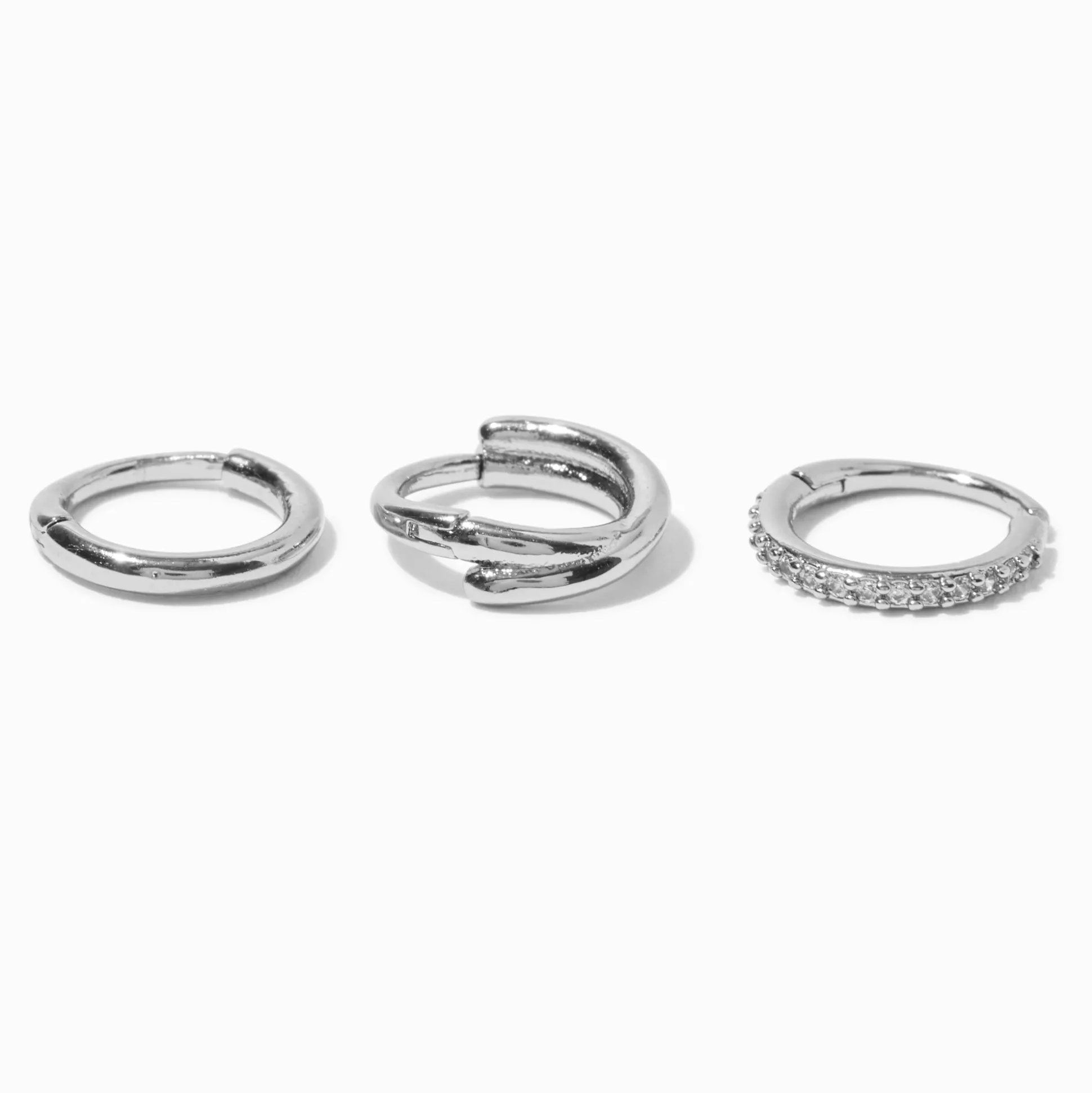 Donne du style à ta collection de bijoux de nez avec ce lot de trois. Le lot en acier inoxydable comprend un anneau sans décoration, un anneau torsadé, et un anneau décoré de zircons cubiques.