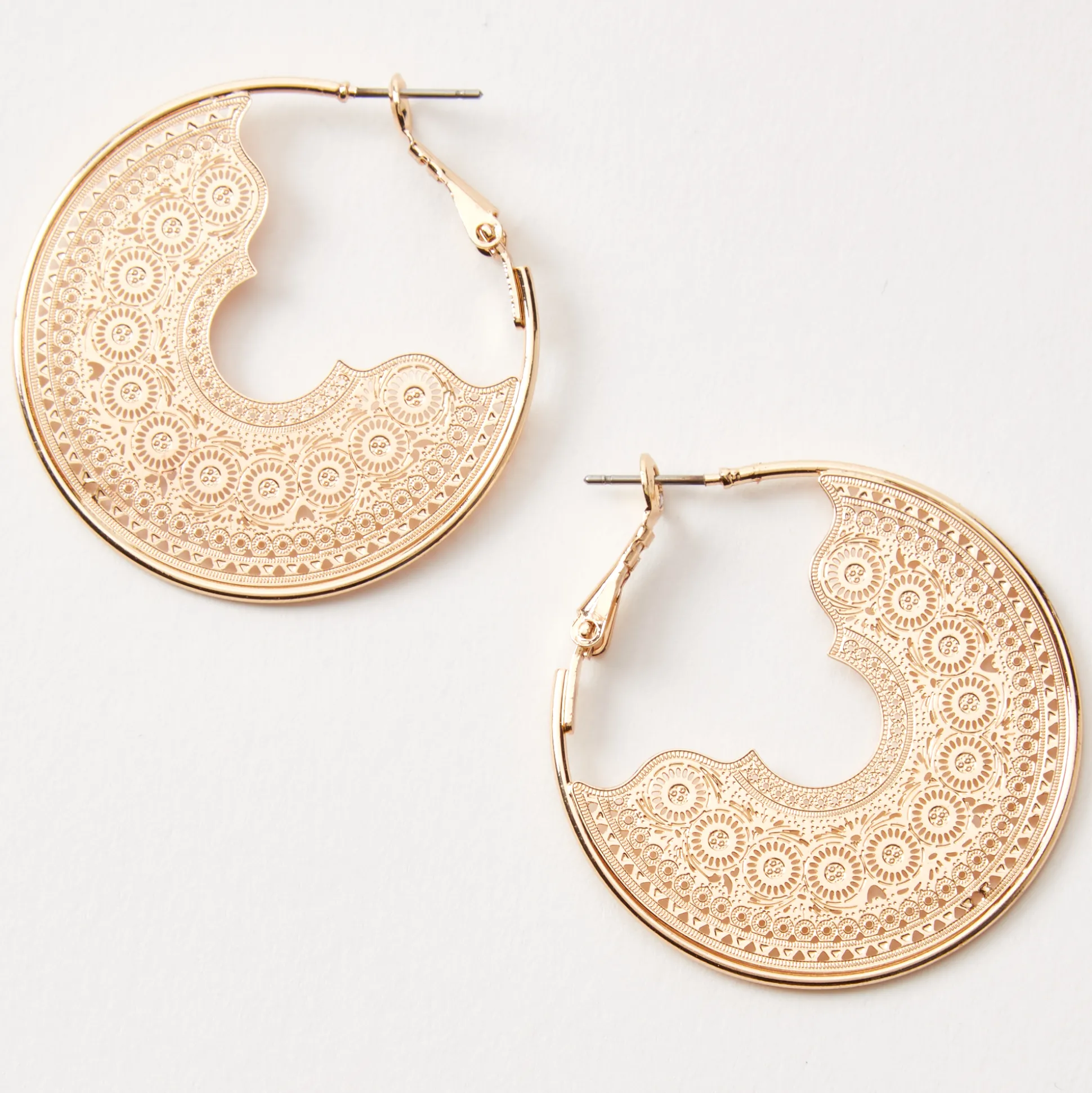 Complète ton look avec une paire d’anneaux d’oreilles délicates ! Ces boucles d’oreilles comprennent un design en filigrane couleur dorée sur chaque anneau.