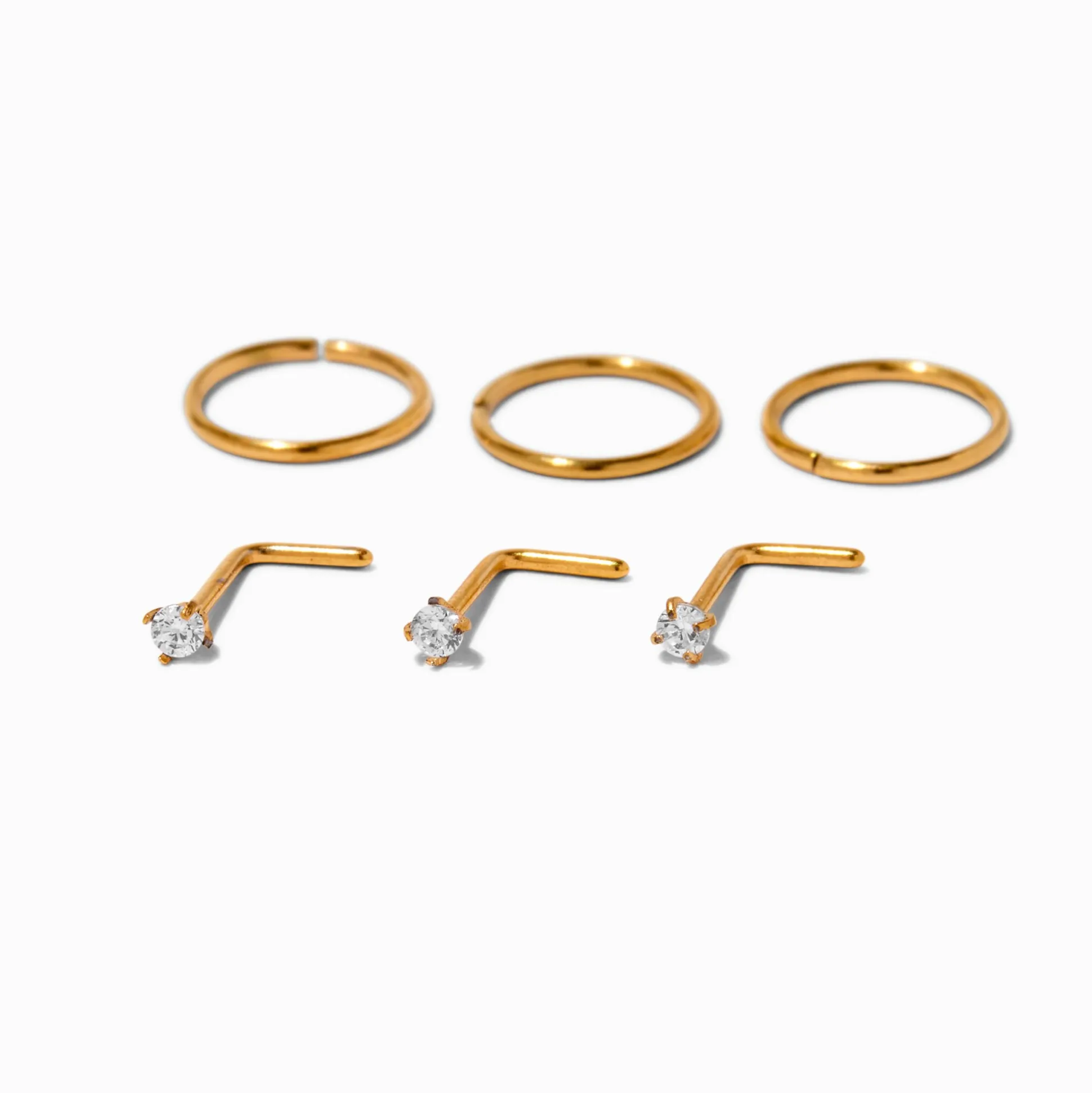 Élargis ta collection de bijoux de nez avec cet incroyable lot de six. Il comprend trois clous avec des strass en zircon cubique et trois anneaux sans décoration.