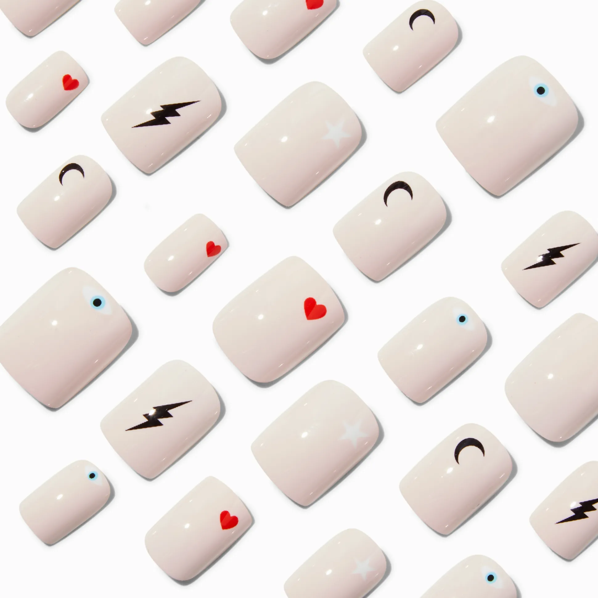 With an improved fit and up to a 7-day wear, these square vegan faux nails are on-trend faves. They come in 12 different sizes, so finding the perfect shaped nail is a breeze. With a square shape, these faux nails have a light pink finish and have different icons like evil eye, lightning, and more.