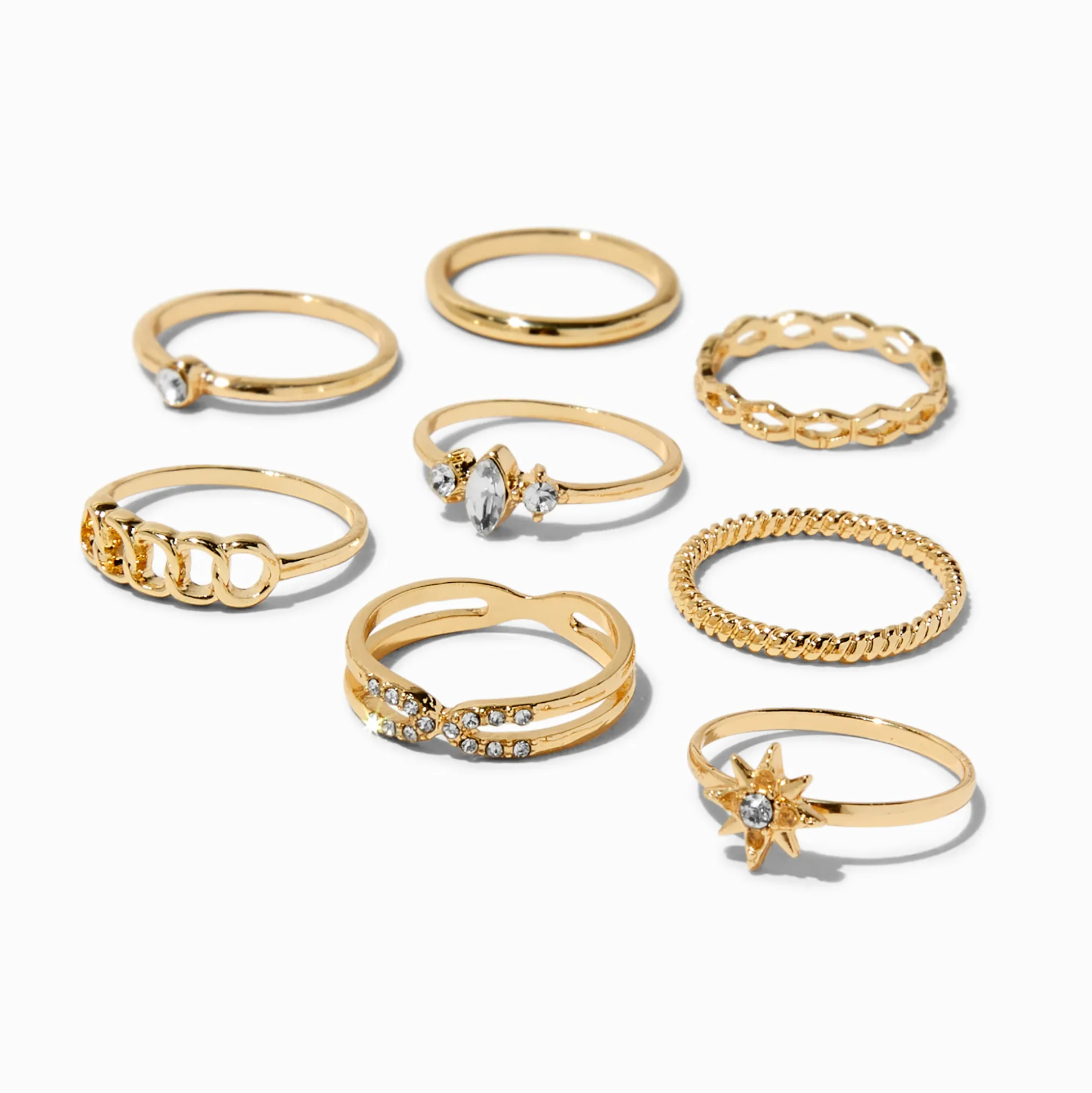 Décore tes doigts en mode géométrique et céleste avec ce lot de bagues. Le lot de huit comprend des décorations torsadées et en strass.