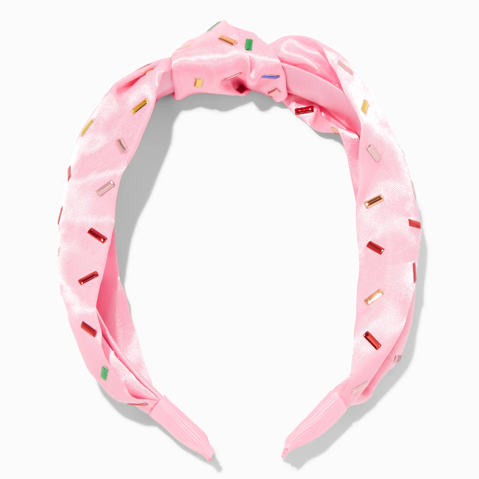 Ce bandeau rose est à croquer ! Il arbore un design noué et des détails strass vermicelles multicolores parsemés sur tout le bandeau.