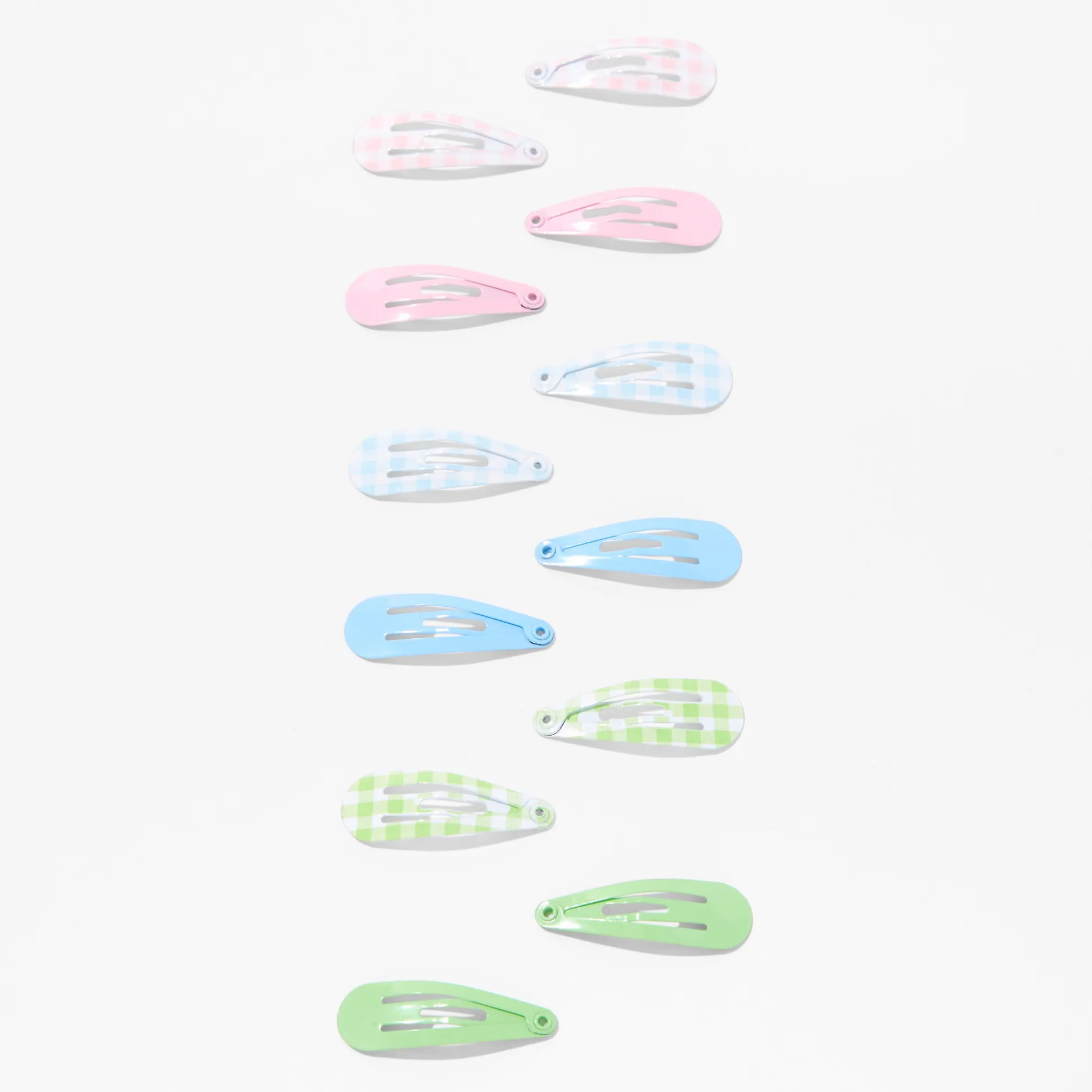 Les barrettes apportent une touche si douce à toutes les coiffures ! Ce lot de douze barrettes comporte des motifs vichy pastel et unis que tu vas adorer.
