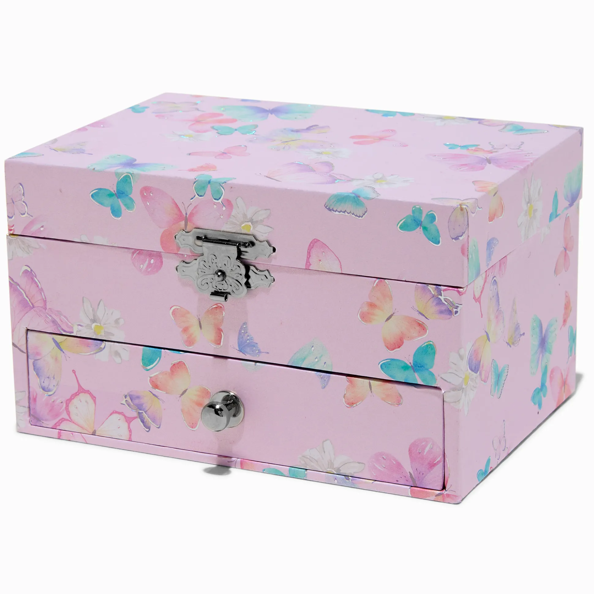 Garde tes bijoux et tes accessoires préférés en lieu sûr avec cette jolie boîte à bijoux arborant des papillons prenant leur envol ! L’extérieur de la boîte a un fini aux tons froids, faisant du tout une décoration parfaite pour ta chambre. L’intérieur est violet, avec de nombreux compartiments, des rouleaux pour tes bagues, un miroir, un plateau amovible et un tiroir inférieur. Utilise le loquet pour sécuriser tes petits objets, et emporte cette boîte partout avec toi !