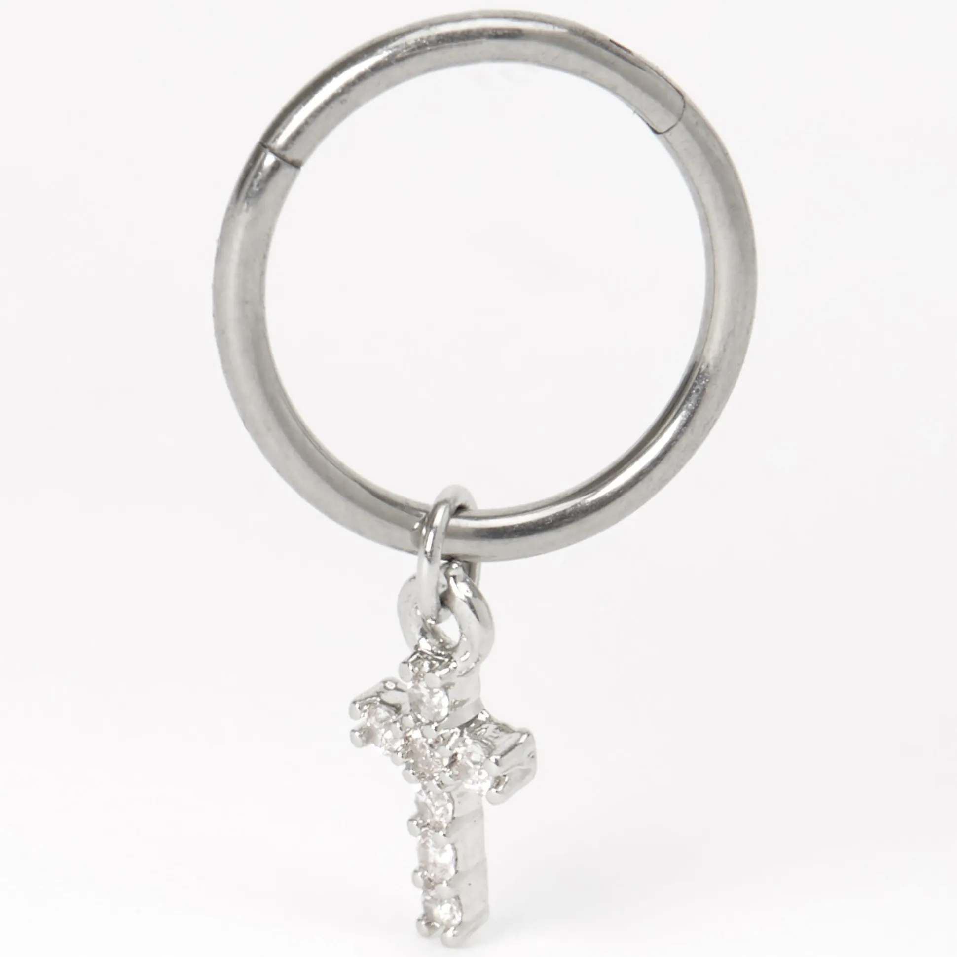 Ajoute un joli éclat à ton oreille avec cette boucle d’oreille pour piercing de cartilage. Cette créole couleur argentée est agrémentée d’une breloque croix en strass suspendue à la partie inférieure.