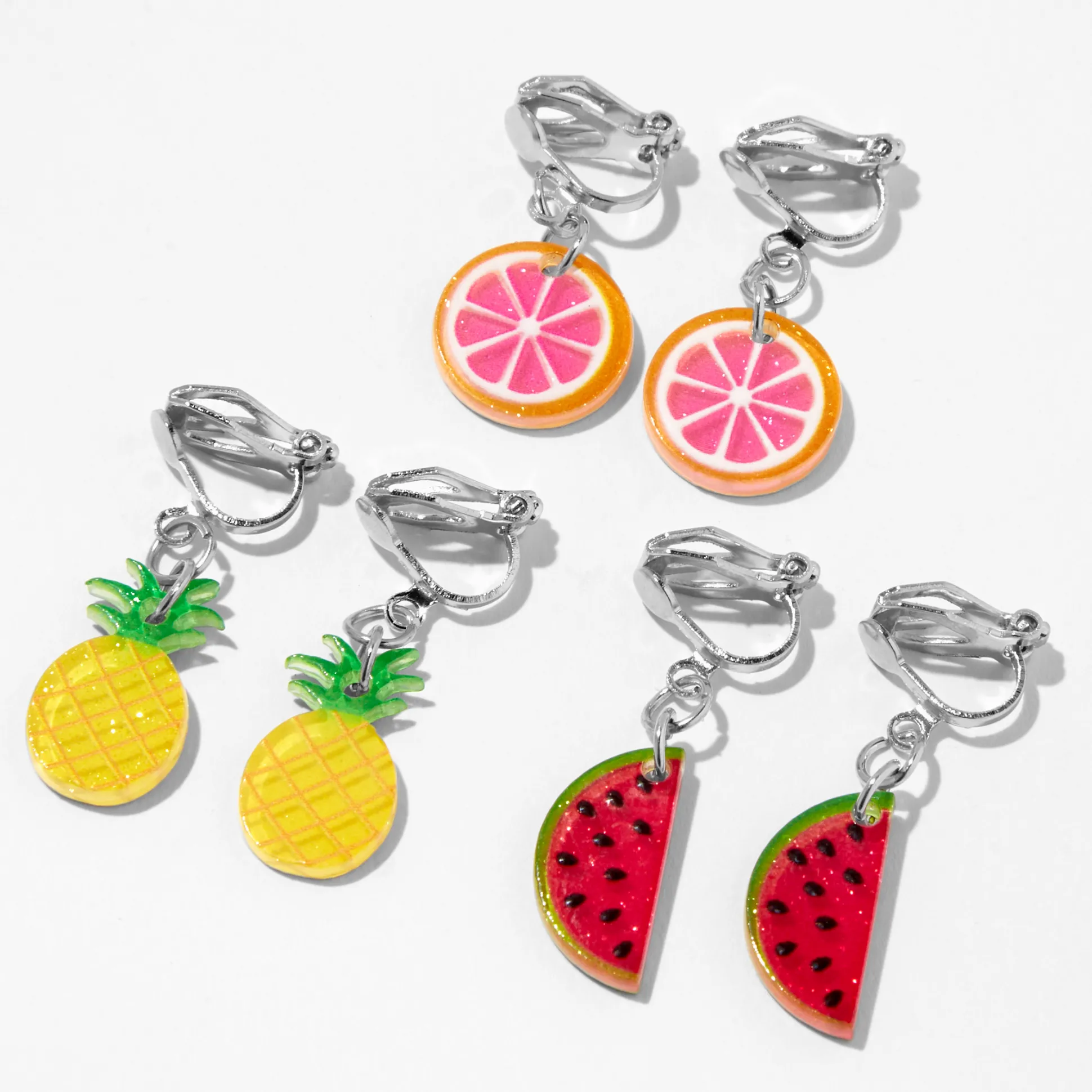 Opte pour une tenue super fruitée grâce à ce lot de boucles d’oreilles à clip super adorables ! Ce lot de trois paires comprend des boucles d’oreilles pamplemousse, ananas et pastèque – et pas besoin de piercing pour les porter !