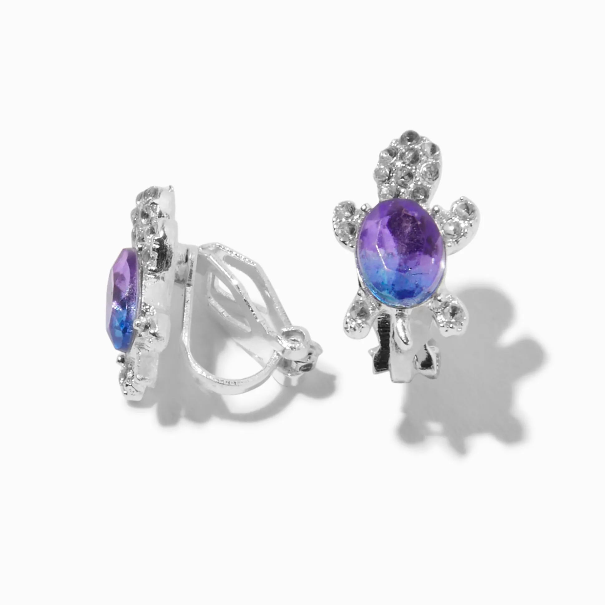 Cette paire de clous d’oreilles à clip tortue est extrêmement cool ! Ces clous d’oreilles couleur argentée ont la forme de tortues recouvertes de strass et leurs centres sont constitués de strass bleus et violets.