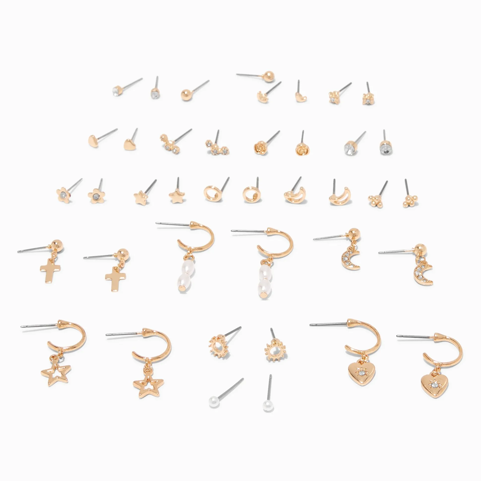 Ce lot aux designs nombreux et variés est un concentré de style intergalactique. Le lot couleur dorée comprend 20 paires de clous et de créoles huggies avec des étoiles, des lunes, des soleils rayonnants, des perles d’imitation, et bien plus encore.