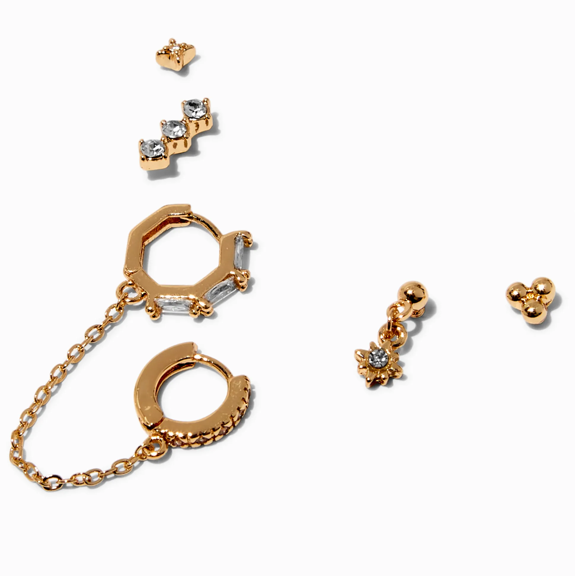 Ces boucles sont comme une fête pour tes oreilles ! Ces trois paires de boucles d’oreilles sont parfaitement coordonnées si tu as plusieurs piercings et que tu veux créer une superposition sur tes oreilles. Elles arborent des zircons cubiques et des strass scintillants.
