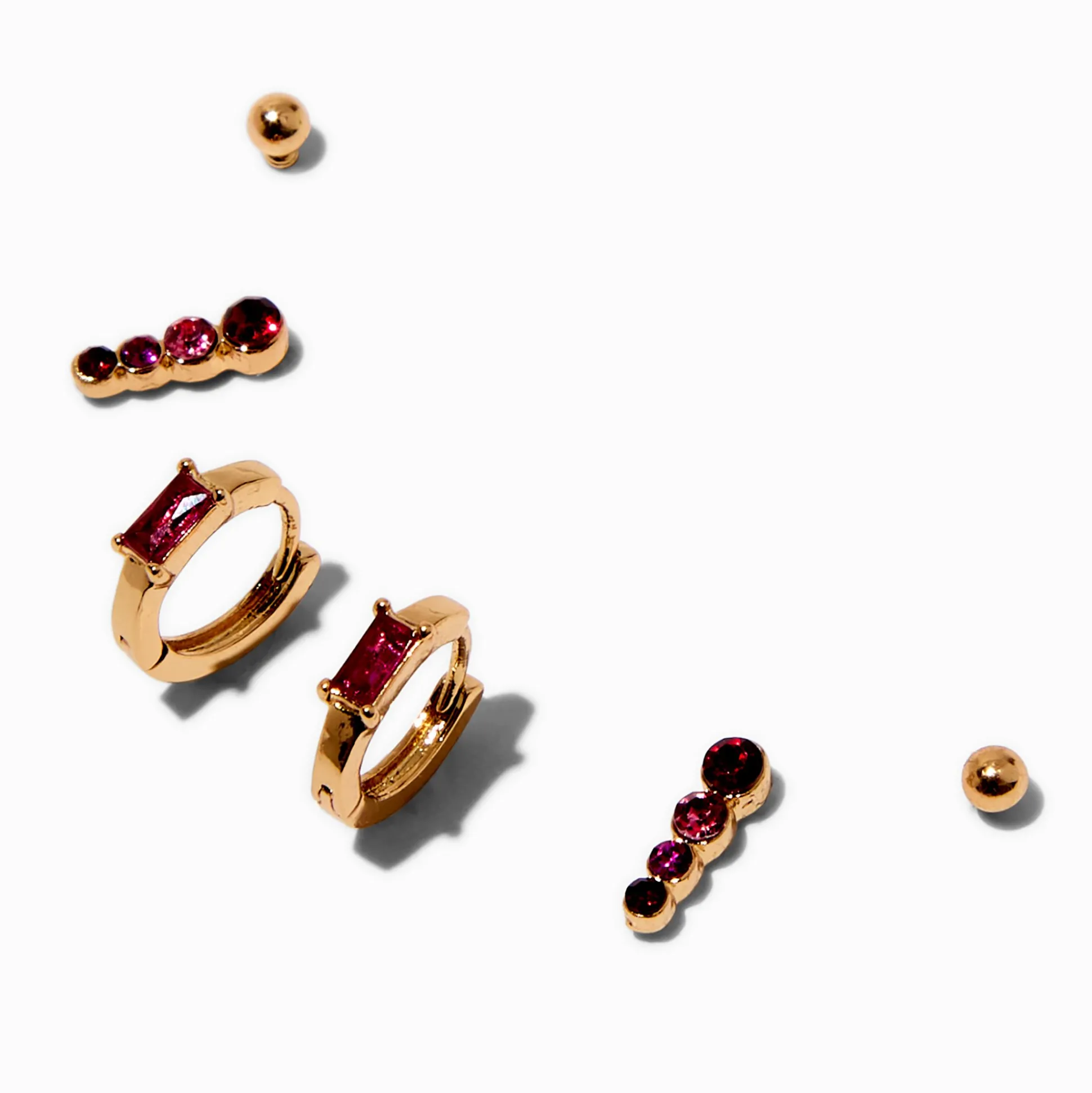 Mets en valeur tes multiples piercings à l’oreille avec ce lot couleur dorée. Il comprend des créoles huggies avec un zircon cubique rouge, des barres avec des strass rouges et des clous d’oreilles boules. Porte-les en même temps ou de la manière que tu veux. Fais-toi plaisir et crée le look de boucles d’oreilles de tes rêves.