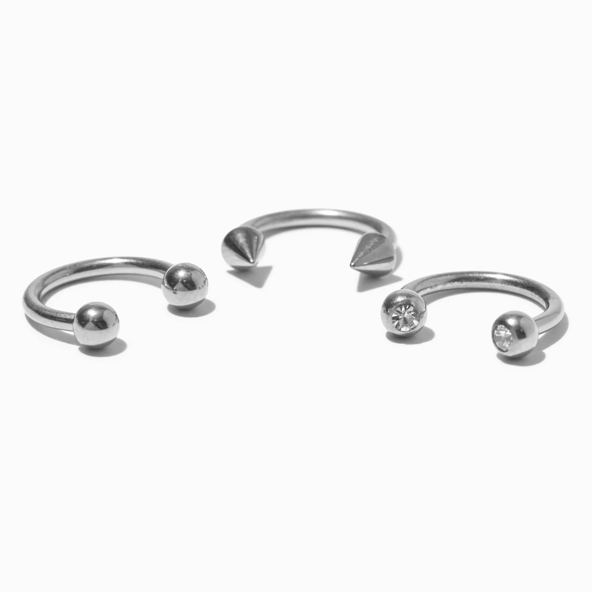 Mets en valeur ton piercing hélix avec ce lot de trois boucles d’oreilles. Les options offertes par ce lot sont des designs fer à cheval couleur argentée avec des boules, des pointes et des clous en strass.
