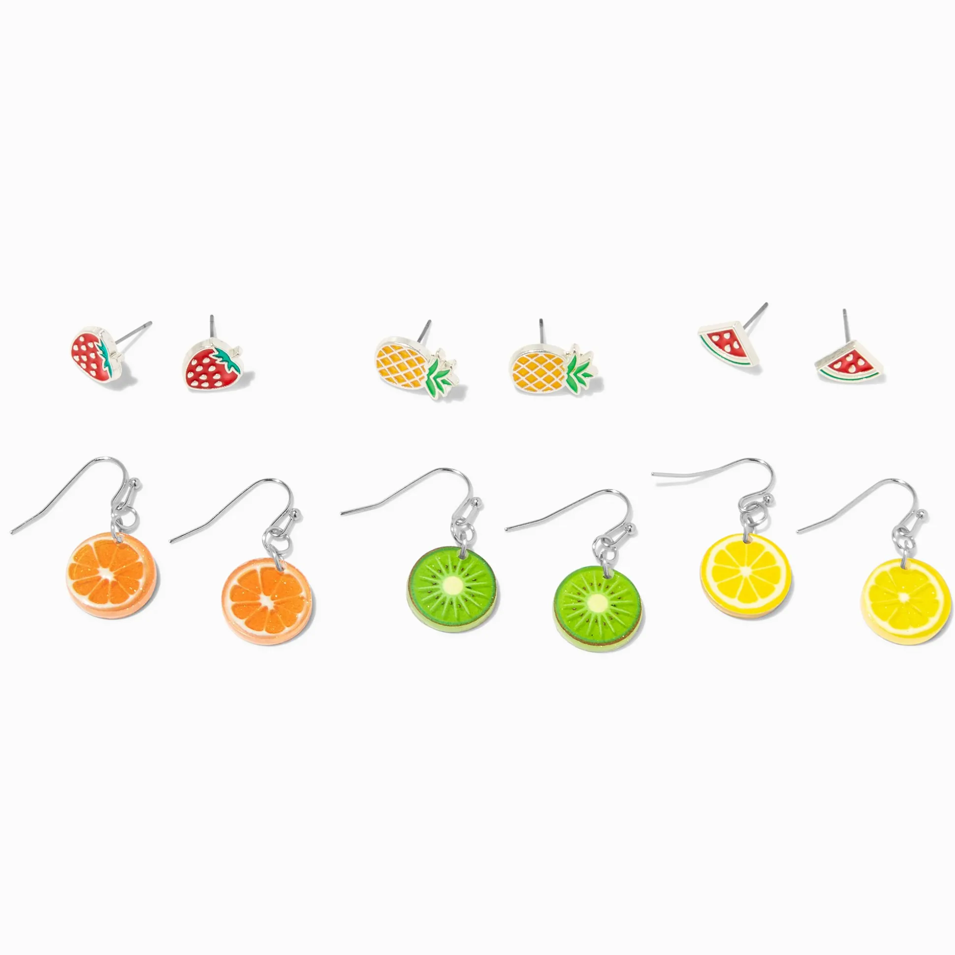 Ce lot de boucles d’oreilles aux designs nombreux et variés fait une super salade de fruits. Il comprend trois paires de clous et trois paires de pendantes – le tout avec des designs fruits aux couleurs vives. Les fruits comprennent des fraises, des ananas, des pastèques, des oranges, des kiwis et des citrons.