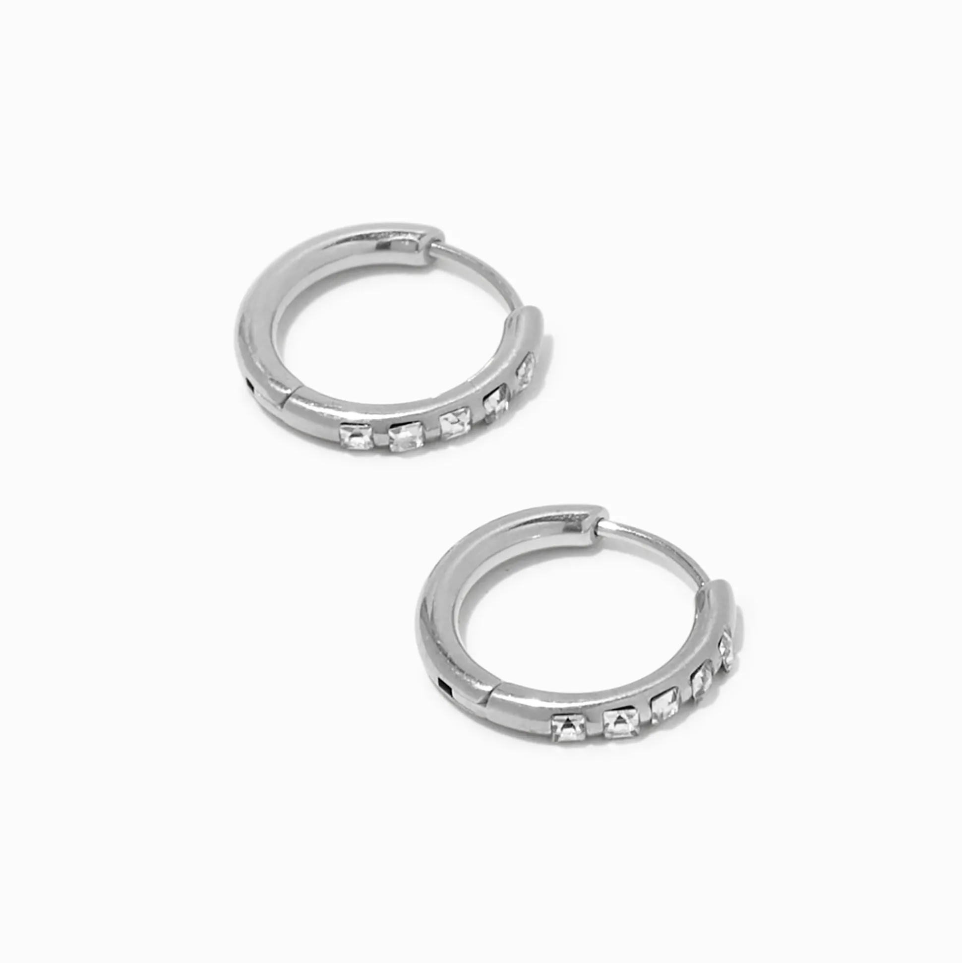 Bichonne tes oreilles en leur offrant ces petites beautés en titane ! Ces boucles d’oreilles huggies arborent des strass carrés scintillants avec une fermeture à charnière qui enveloppera parfaitement tes oreilles.