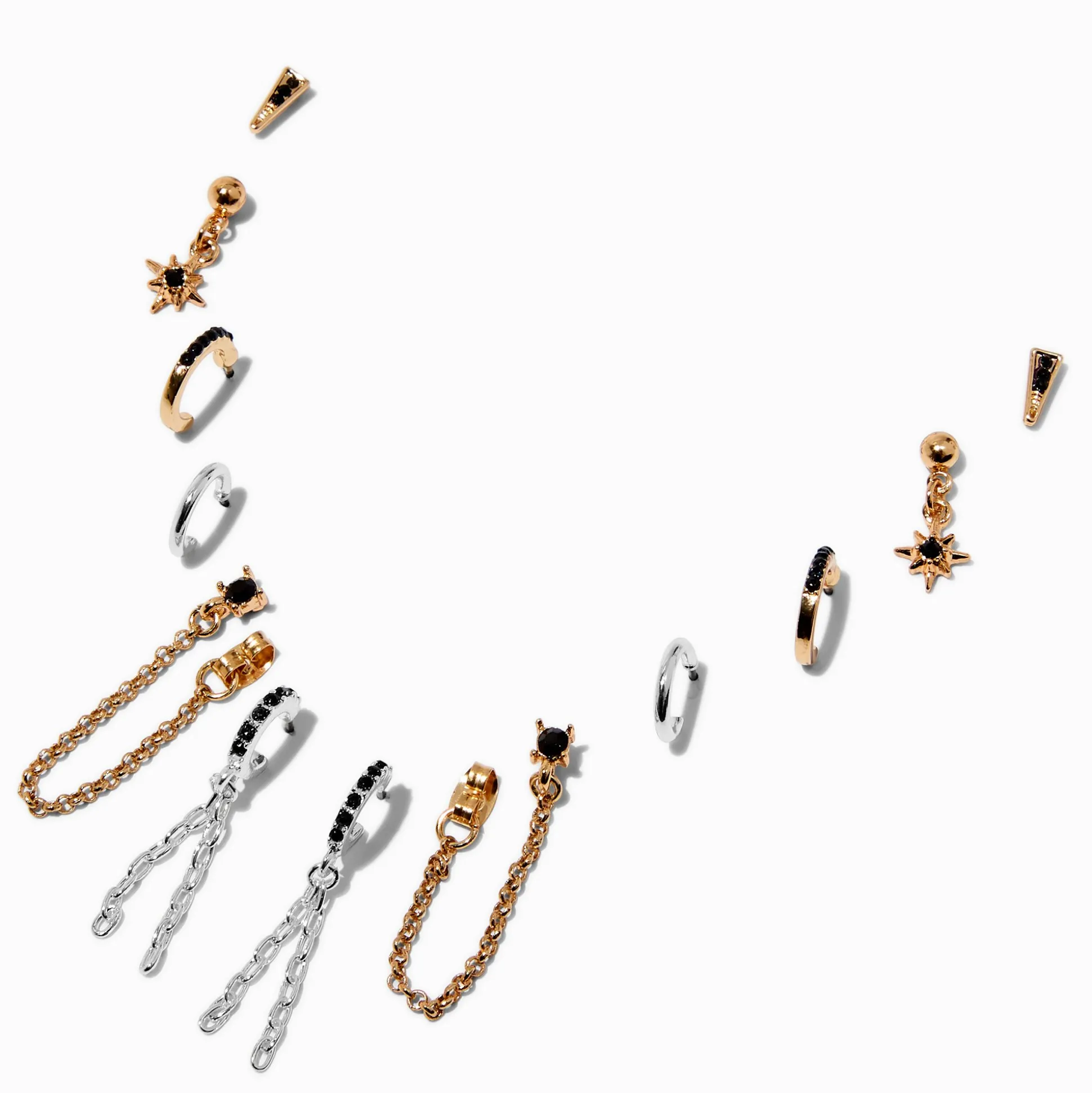 Parfaites pour arborer fièrement ton piercing double ou plus, ces boucles d’oreilles dont les couleurs sont coordonnées peuvent être mélangées, assorties et empilées pour créer ton propre look. Le lot comprend des clous éventail couleur dorée, des pendantes couleur dorée avec des étoiles strass noirs, des créoles couleur dorée avec des ornements en strass noirs, des créoles couleur argentée, des clous de strass noirs avec des chaînes qui les relient à l’avant et à l’arrière.