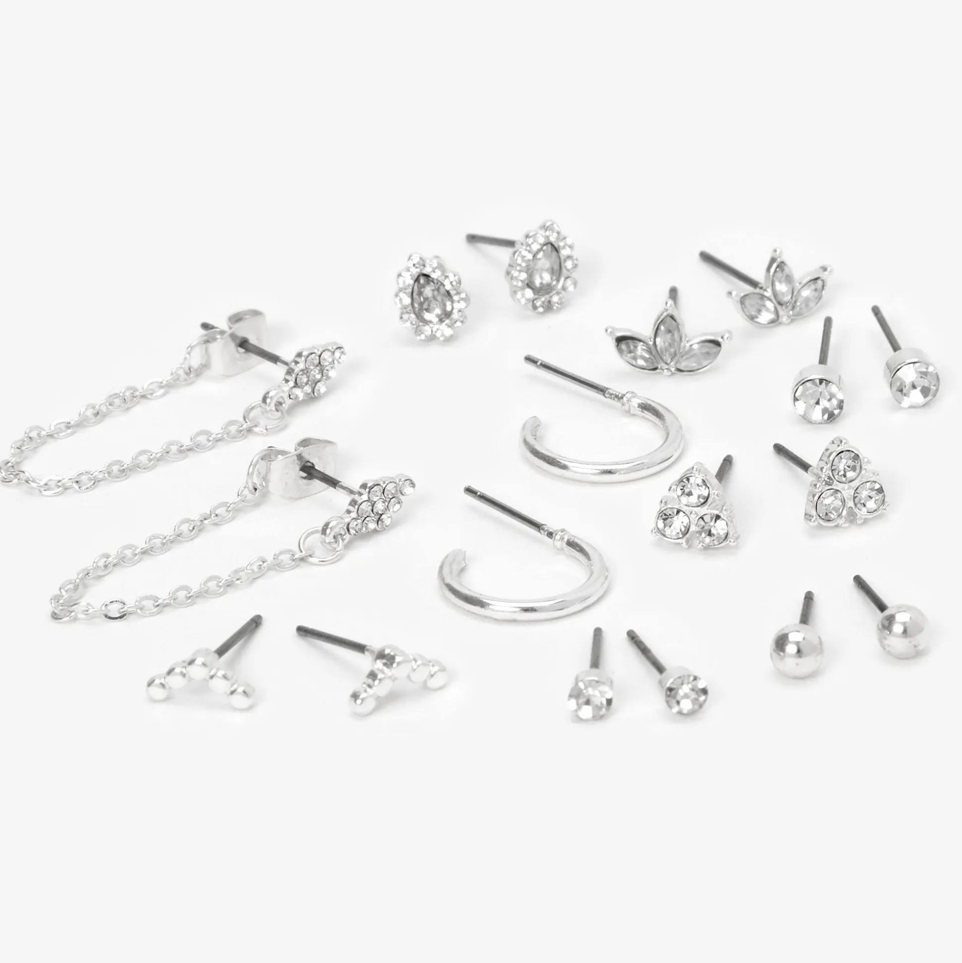 Sois tendance avec ce lot de créoles et de clous couleur argentée classiques ! Ce lot de boucles d’oreilles comprend des clous et des pendantes, avec des strass.