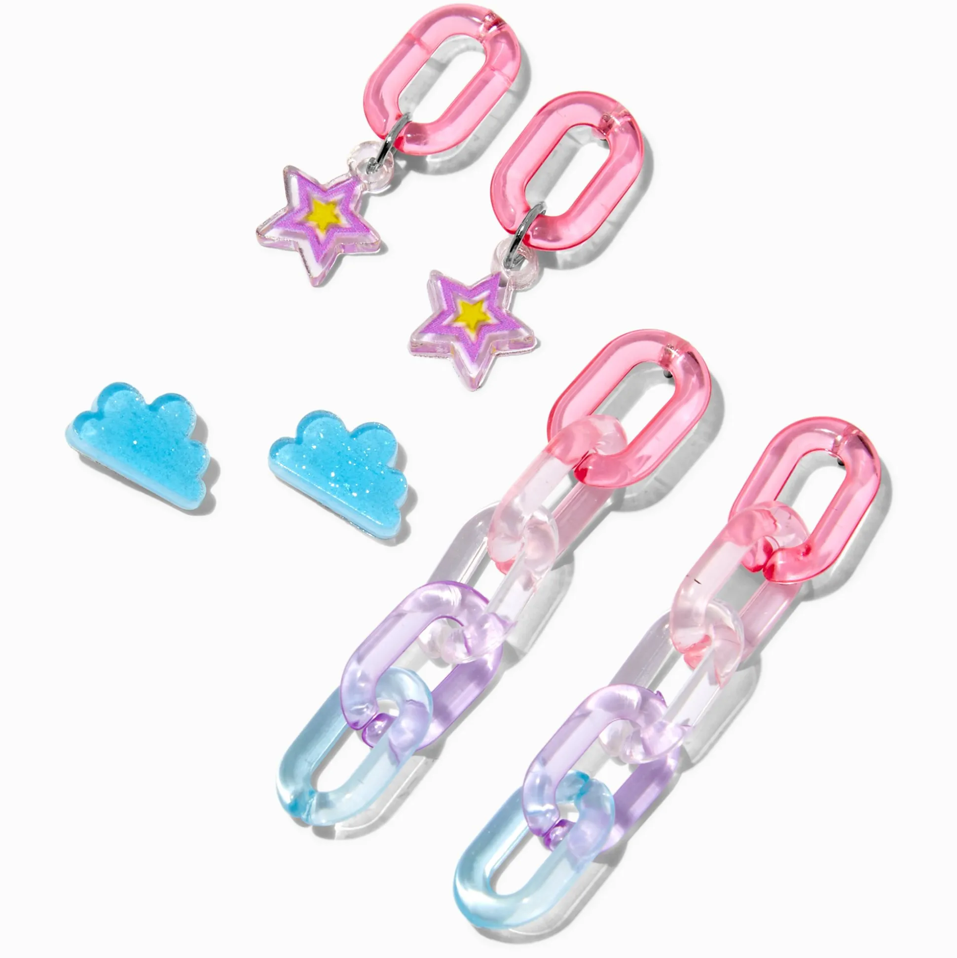 Crée un vrai paysage de rêve sur tes oreilles avec ce lot de boucles d’oreilles superposables. Le lot de trois comprend des clous nuage bleus, des pendantes chaînettes roses avec des étoiles pendantes, et des pendantes chaînettes multicolores.