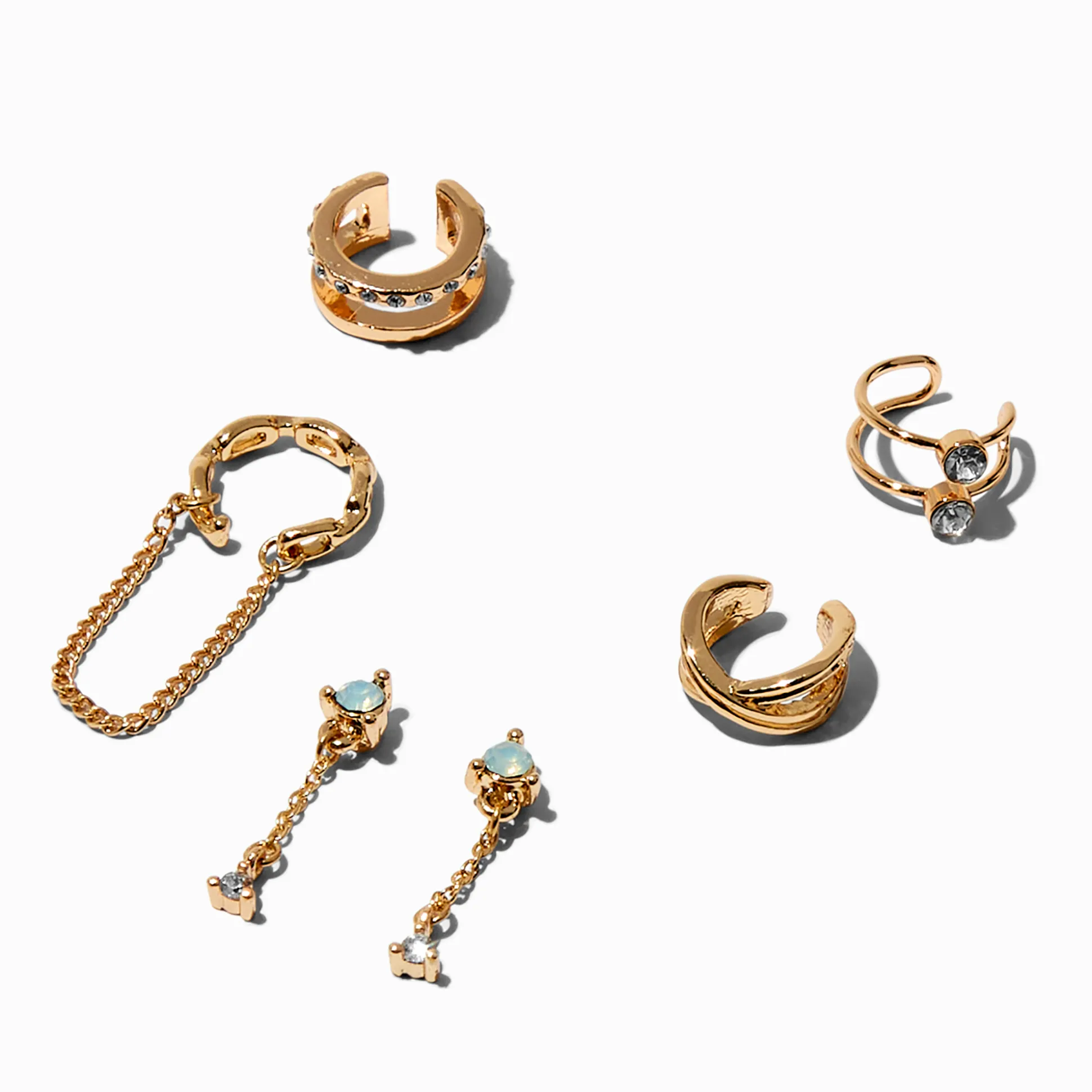 Crée un look unique autour de tes oreilles avec le style de ce lot de manchettes d’oreilles superposables. Le lot couleur dorée arbore des détails opale d’imitation et strass et comprend deux pendantes ainsi que quatre manchettes d’oreilles ornementées avec des chaînes.