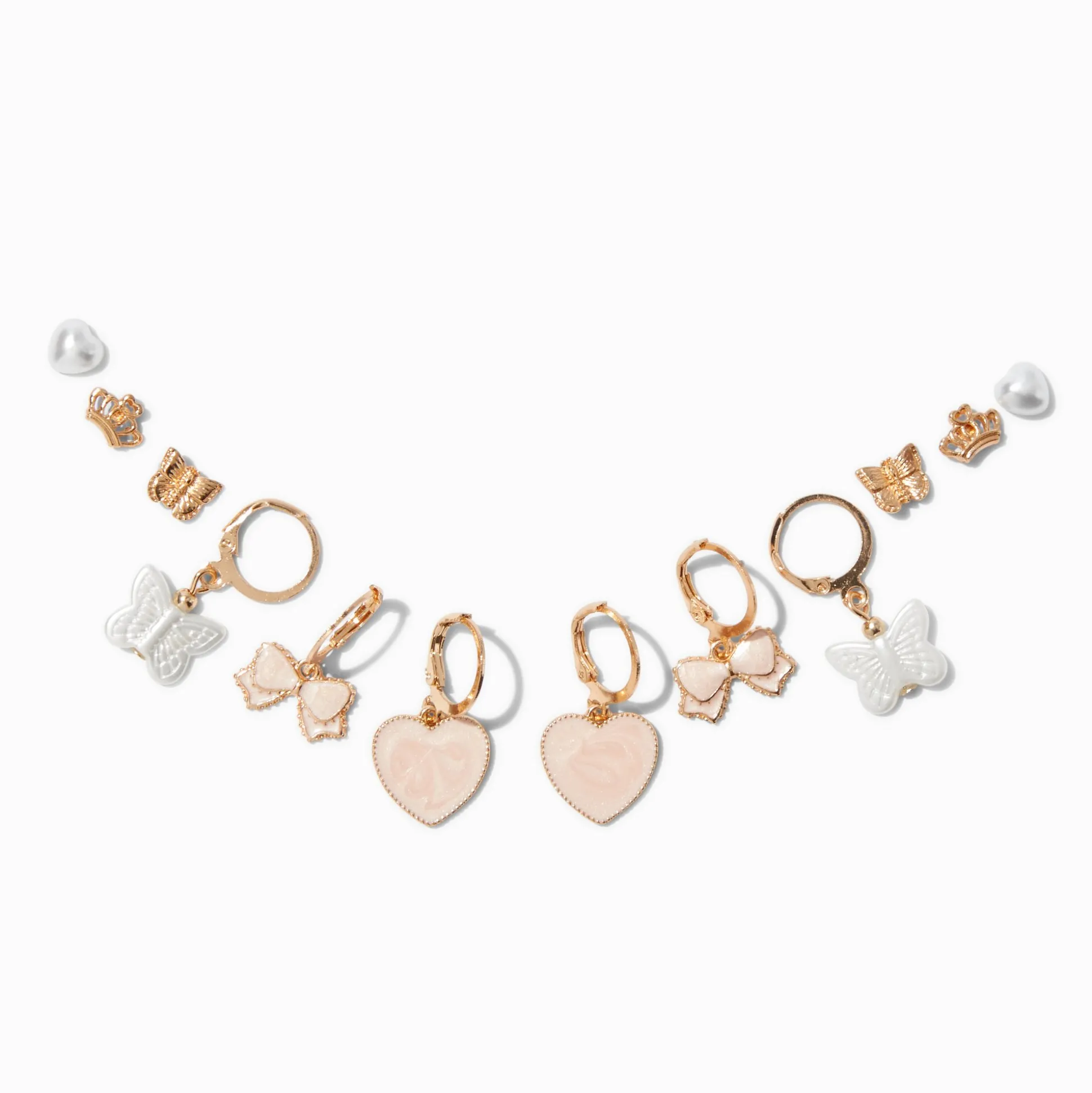 Mets en valeur tes multiples piercings avec ces boucles d’oreilles dont les couleurs sont parfaitement coordonnées ! Ce lot de six paires comprend des créoles à charnière avec des cœurs roses, des nœuds roses, et des papillons blancs et des clous avec des papillons, des couronnes, et des perles d’imitation.