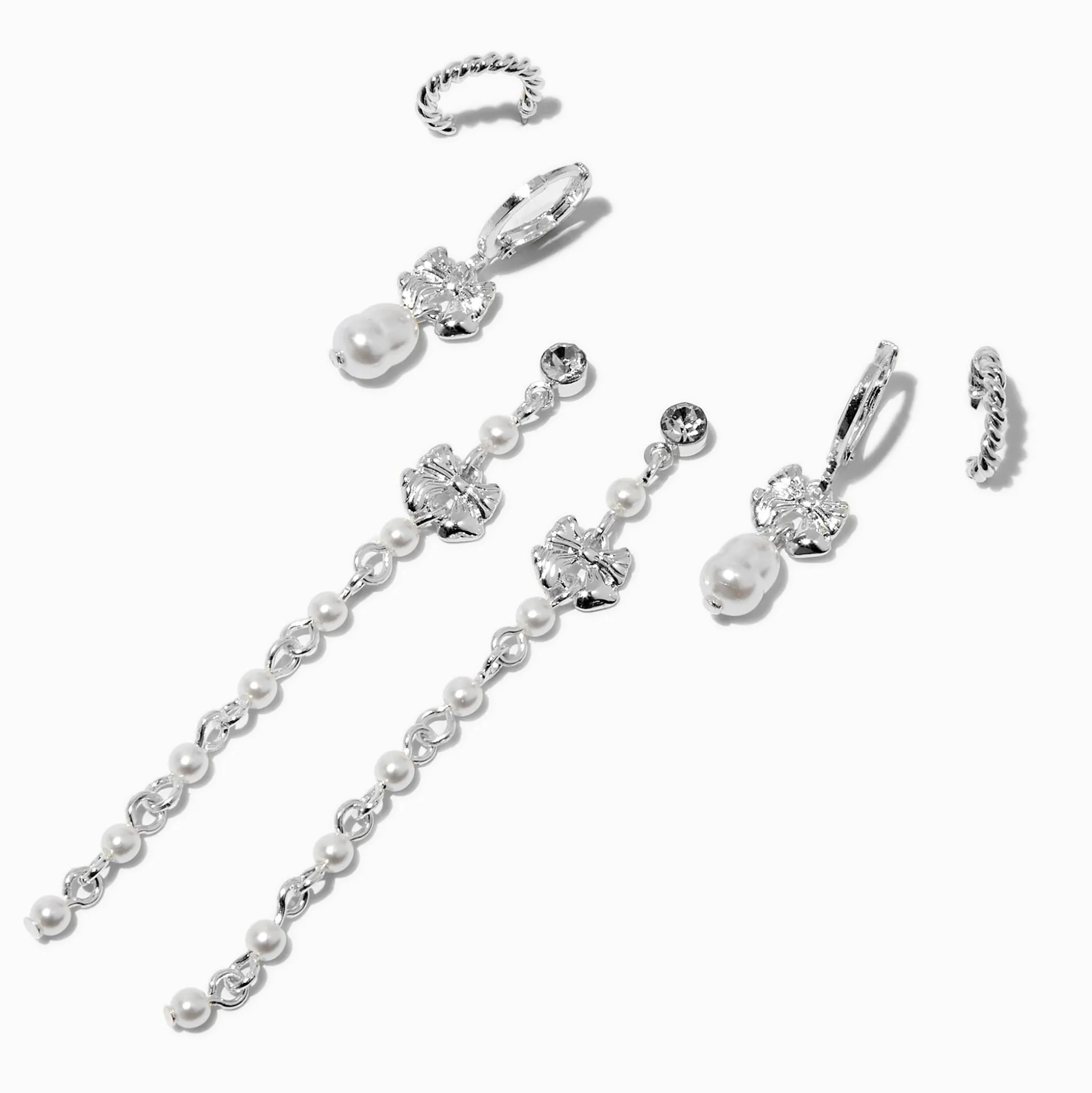 Mets en valeur tes multiples piercings ! Empile ce lot de trois paires de boucles d’oreilles pour créer ton propre look. Le lot comprend trois paires couleur argentée avec des créoles torsadées, des créoles avec des petits pendentifs perle d’imitation et nœud, et des pendantes recouvertes de perles d’imitation avec un détail nœud.