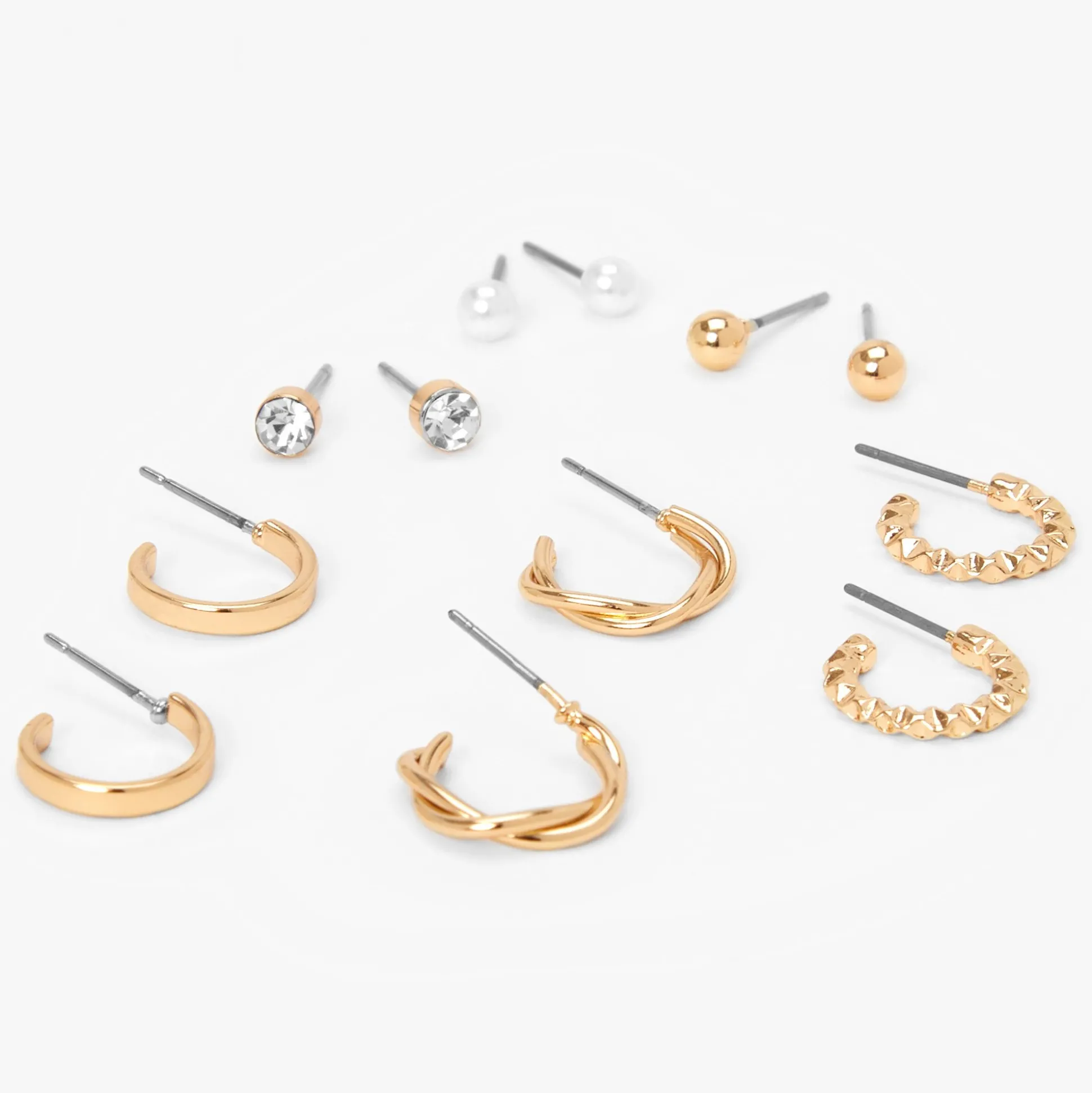 Élargis ta collection de boucles d’oreilles avec ce lot de créoles et de clous d’oreilles couleur dorée avec des strass et des perles d’imitation. Avec six designs parmi lesquels choisir, tu auras toujours la paire idéale pour n’importe quelle tenue.