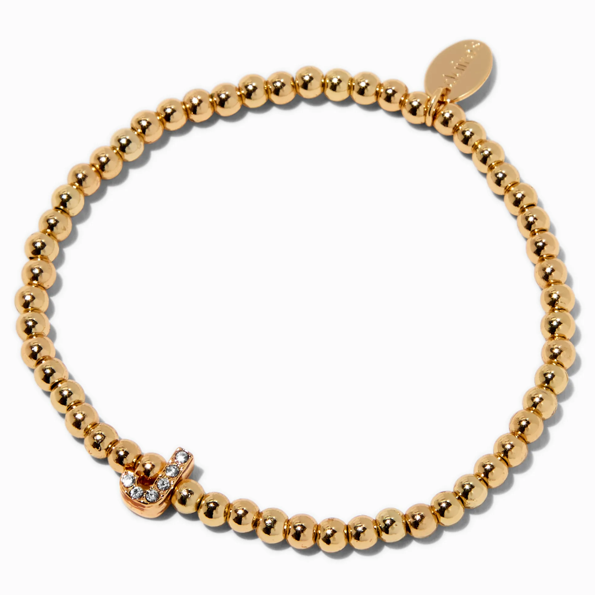 Porte ton initiale avec fierté ! La lettre est décorée de strass pavés et enfilée sur un bracelet perlé couleur dorée.