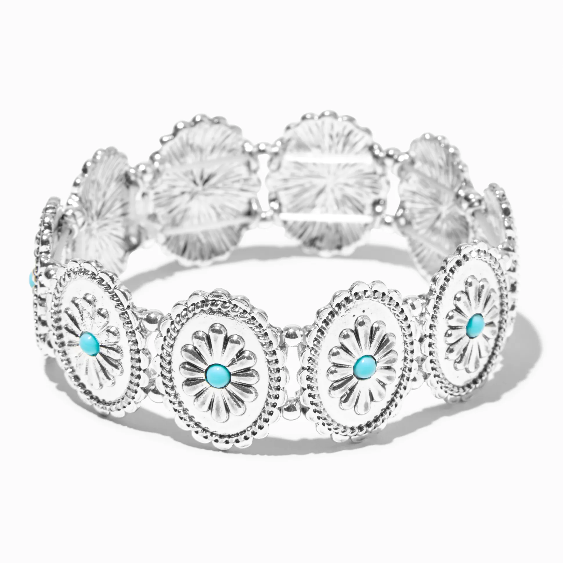 Décore ton poignet avec ce bracelet élastique couleur argentée. Il arbore des éléments en turquoise d’imitation décorant des médaillons ronds ornés de fleurs en filigrane.