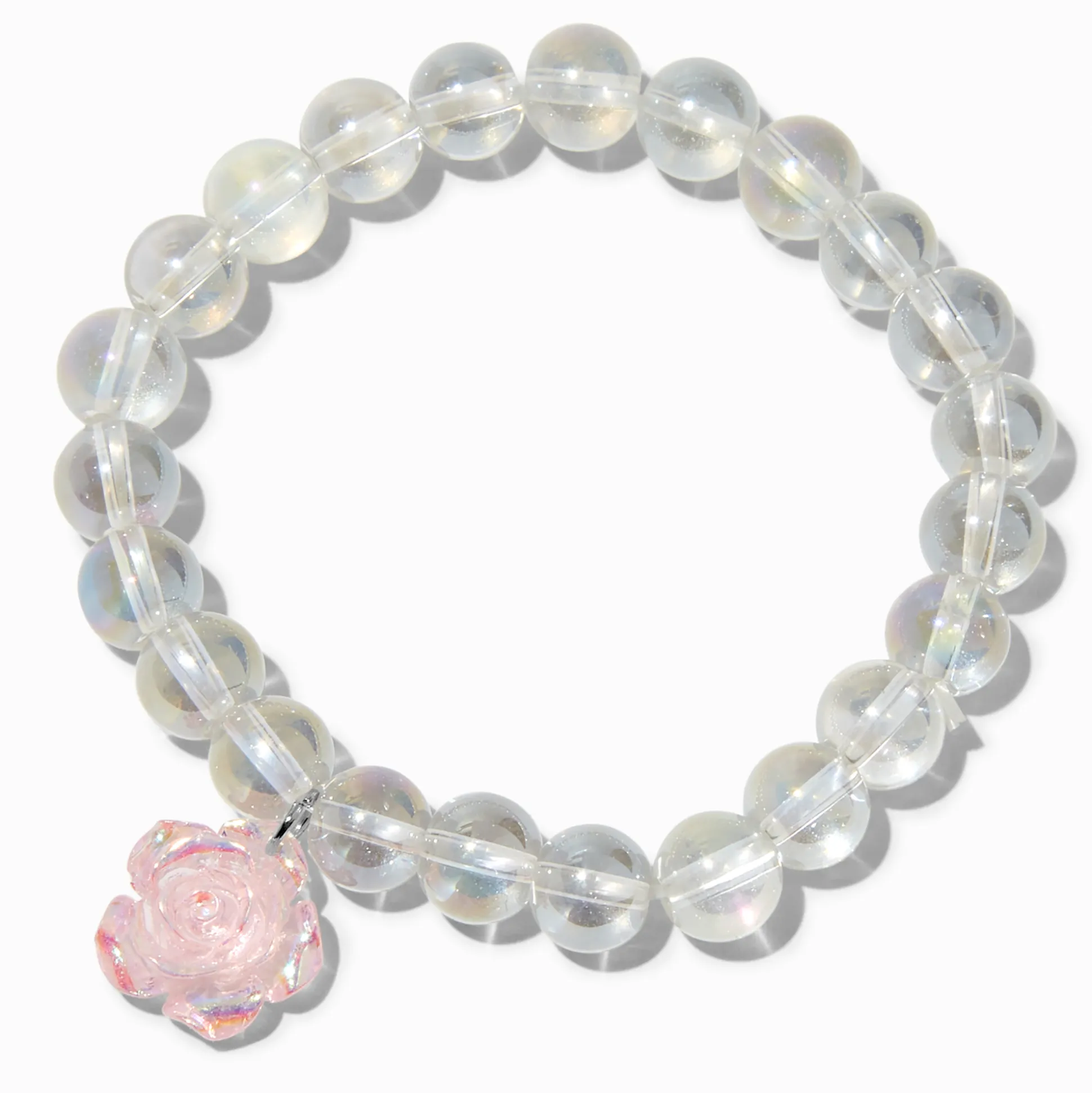 Quoi de mieux qu’une rose parfaite ? Ajoute une touche florale à ton bras grâce à ce bracelet élastique. Il arbore des perles d’imitation transparentes avec un scintillement iridescent super cool et une breloque rose sculptée diaphane de couleur rose.