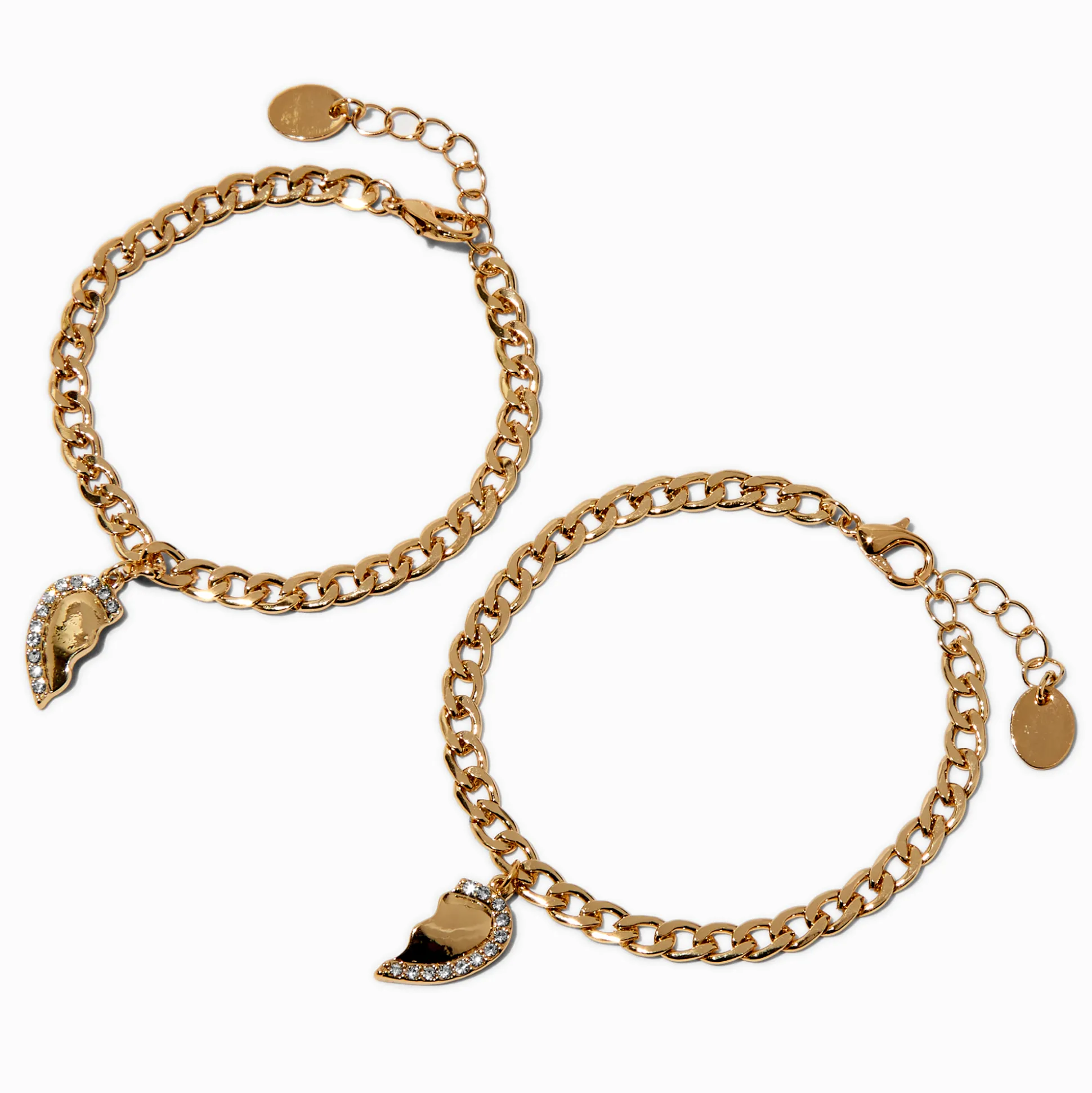Peaufine le look de ta superposition de bracelets grâce à ce lot de deux bracelets. Les bracelets couleur dorée arborent des chaînes à maillons gourmette et des breloques cœur fendu partagé par chaque bracelet.