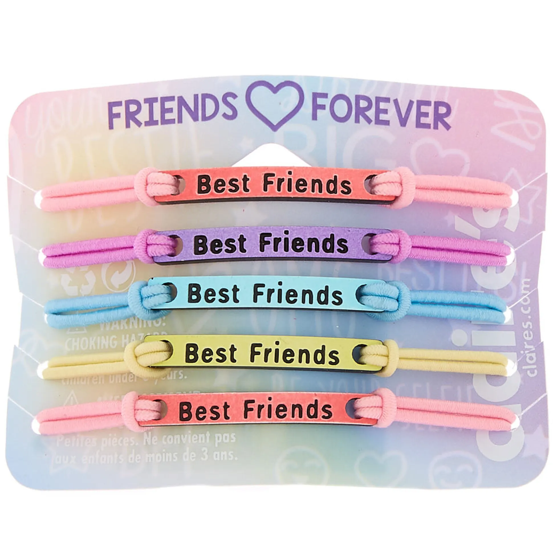 Toi et ta bande de copines pouvez opter pour des accessoires assortis grâce à ces adorables bracelets ! Ce lot comprend des bracelets élastiques « best friends » déclinés en rose, violet, bleu et jaune, de sorte que chacune peut porter sa couleur préférée !