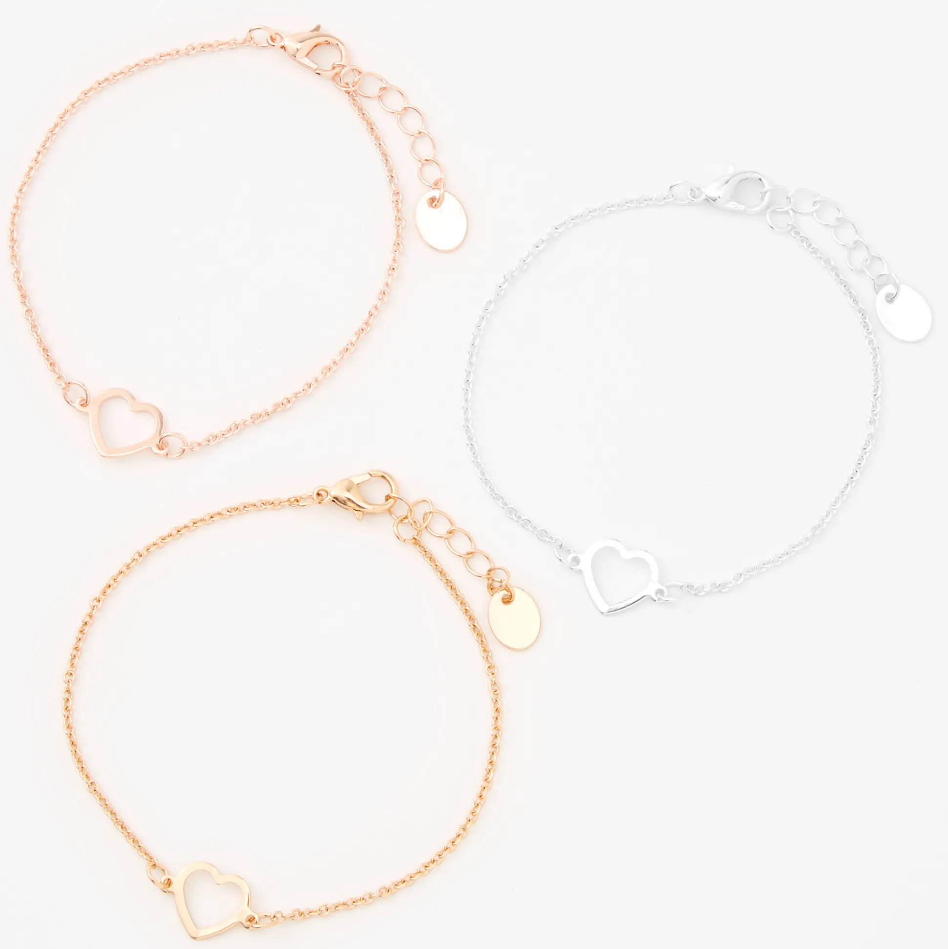 Craque pour ce lot de bracelets en forme de cœur ! Ce lot comprend trois bracelets en trois finis différents : couleur argentée, couleur doré rose et couleur dorée.
