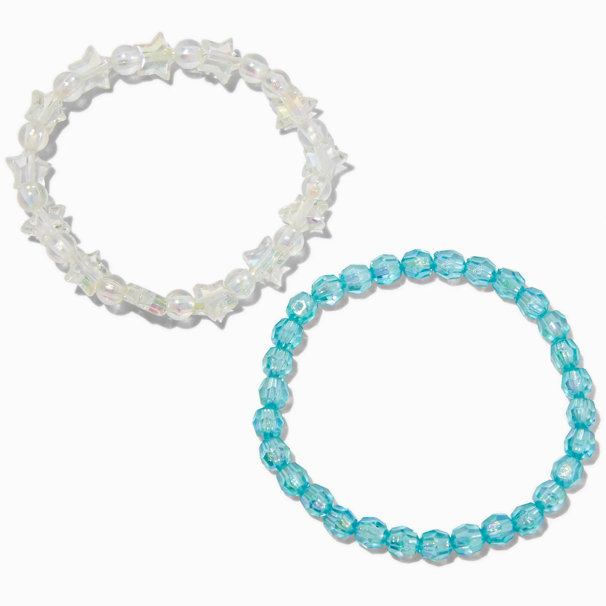 Offre-toi un peu de star power avec ces bracelets super fun à porter. Le lot comprend deux bracelets perlés, l’un avec des billes étoile iridescentes, et l’autre avec des billes aqua.