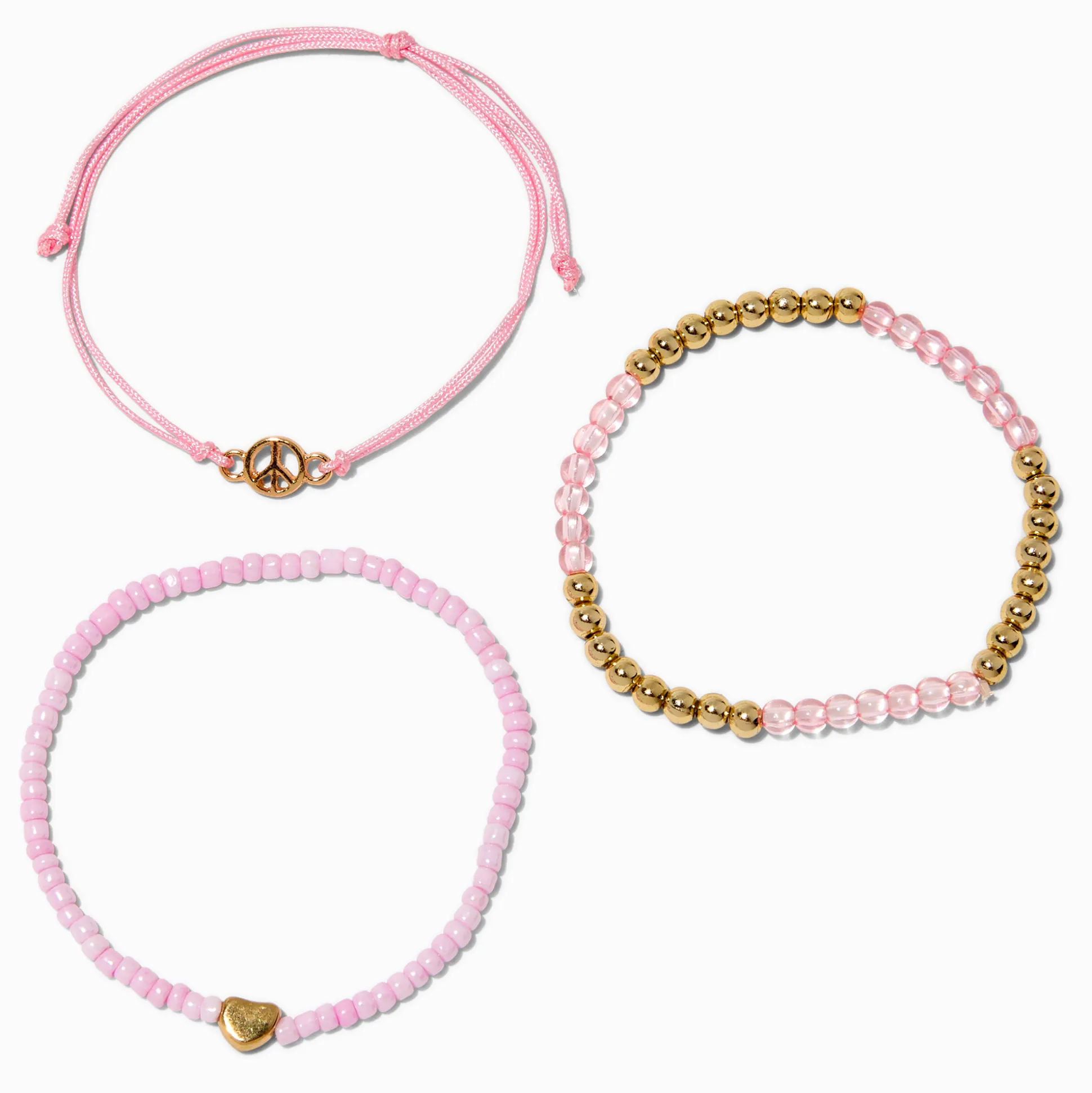 Empile ces bracelets sur ton poignet pour t’offrir une triple dose de style ! Le lot comprend un bracelet élastique avec des billes roses et un cœur couleur dorée, un bracelet élastique avec des billes couleur dorée et roses translucides, et un bracelet de style bolo avec un signe de la paix couleur dorée.