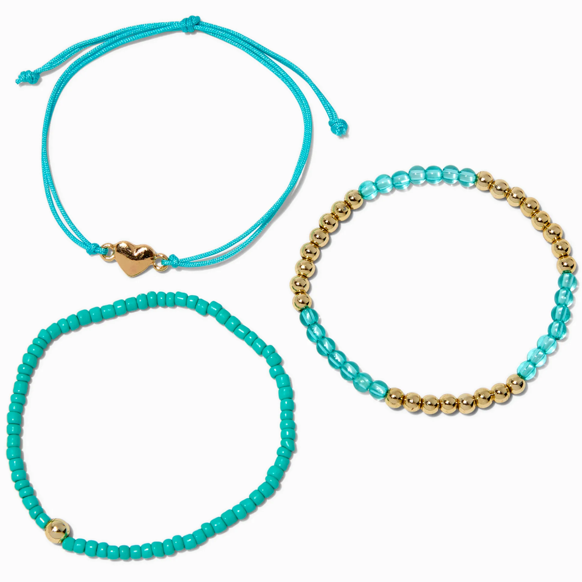 Empile ces bracelets sur ton poignet pour t’offrir une triple dose de style ! Le lot comprend un bracelet élastique avec des billes en turquoise d’imitation et un cœur couleur dorée, un bracelet élastique avec des billes couleur dorée et en turquoise d’imitation translucide, ainsi qu’un bracelet de style bolo avec un détail cœur couleur dorée.