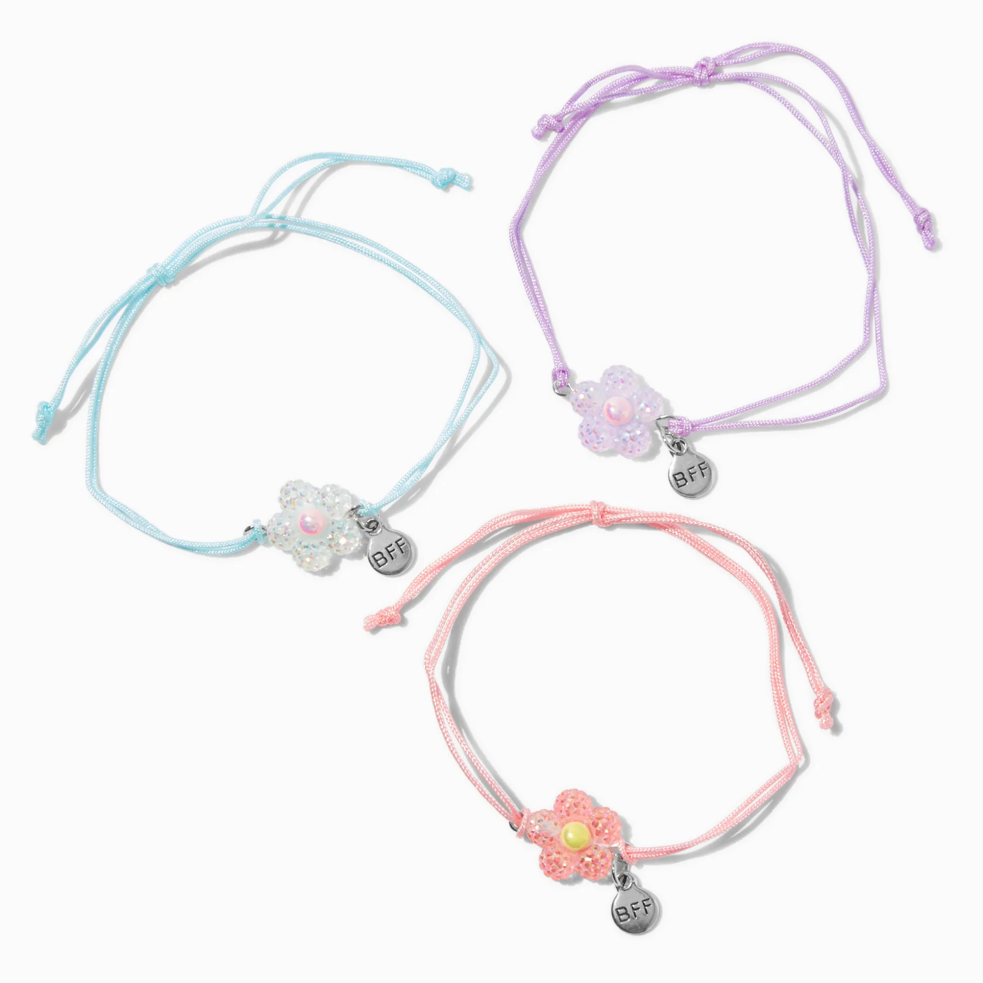 Partage ce lot de bracelets ornés d’adorables fleurs en relief avec tes deux besties pour coordonner vos looks. Le lot de trois bracelets comporte des modèles vert, violet et orange dans les tons pastel. Chacun arbore un petit pendentif « BFF », à porter avec fierté.