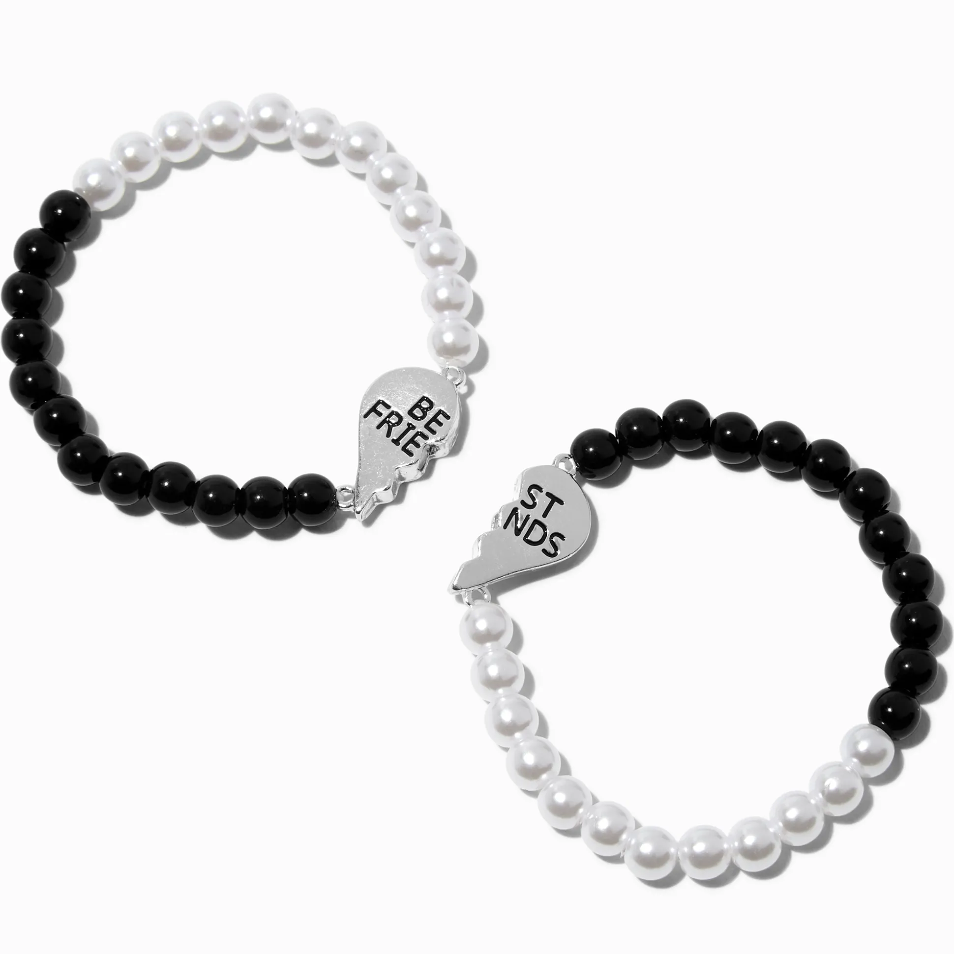 Reste connectée avec tes besties grâce à ces bracelets ! Ce lot comprend deux bracelets élastiques décorés de billes noires sur une moitié et de perles d’imitation sur l’autre. Le tout est relié à une breloque cœur fendu avec l’inscription « Best Friends ».