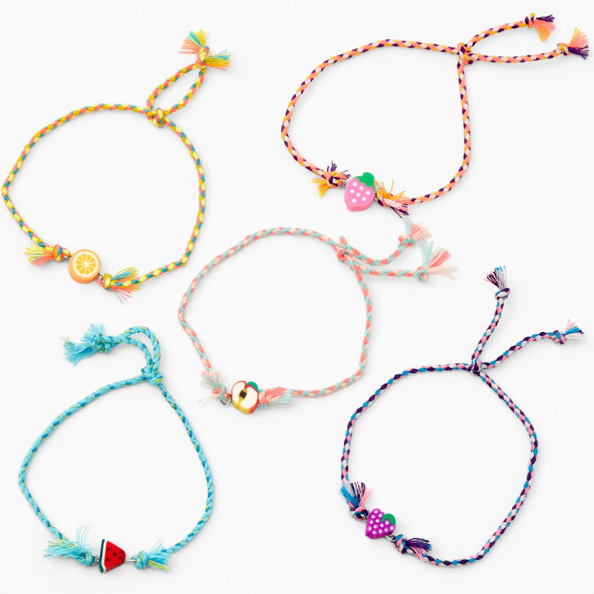 Sois la star de ton pique-nique avec ces bracelets fruits, tous réglables et assortis. Assure-toi de manger (et de porter !) tes fruits. Chaque bracelet comporte une breloque fruit appétissante ! Tu peux aussi bien n’en porter qu’un seul pour peaufiner ton look estival ou bien les porter tous en même temps pour créer LA salade de fruits ultime. Avec leurs nuances vives et complémentaires, ces bracelets constituent un accessoire sobre qui embellira toutes tes tenues.