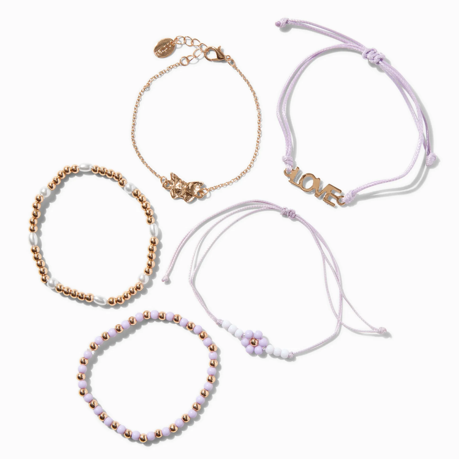 Donne-toi le choix avec ce lot de cinq bracelets. Les bracelets comprennent un bracelet bolo « Love », un bracelet bolo fleur, un bracelet de chaîne papillon, et deux bracelets élastiques à billes. Portes-en un ou superpose-les pour créer ton propre style.