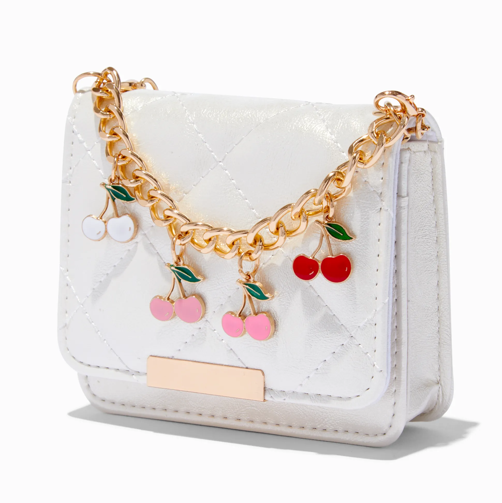 This wristlet features a cherry charm design, plus a crossbody strap for hands-free convenience. Inside, there are card slots and a zippered pouch for coins.