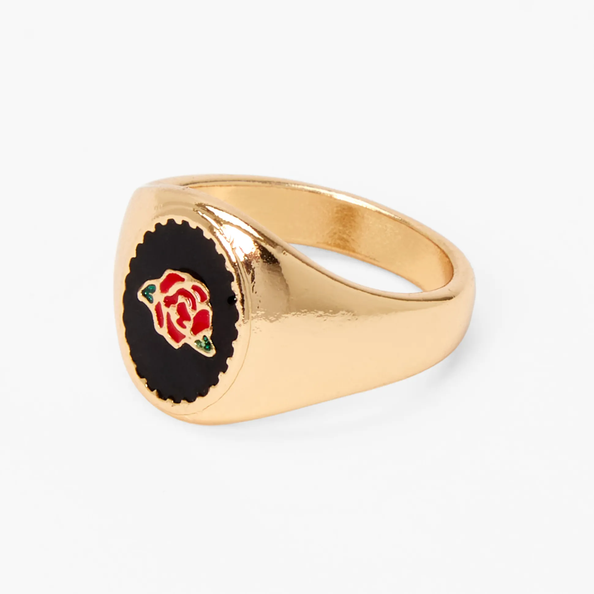 Distingue-toi des autres en portant cette chevalière ! La bague arbore un fini couleur dorée et un plat de couleur noire avec une rose rouge.