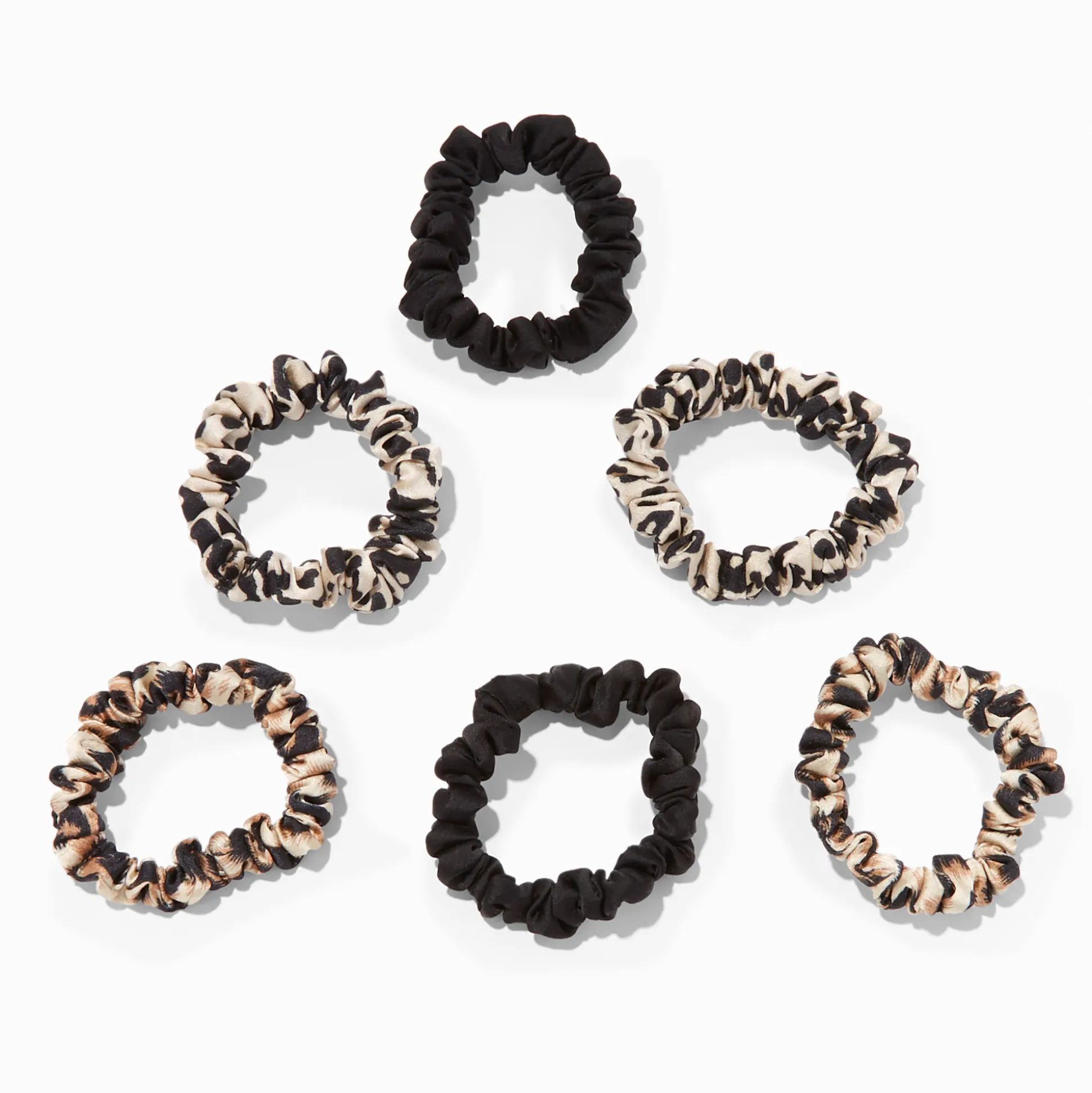 Choisis le chouchou parfait dans ce lot de six. Le lot comprend six chouchous fins soyeux noirs et avec des imprimés animaux.