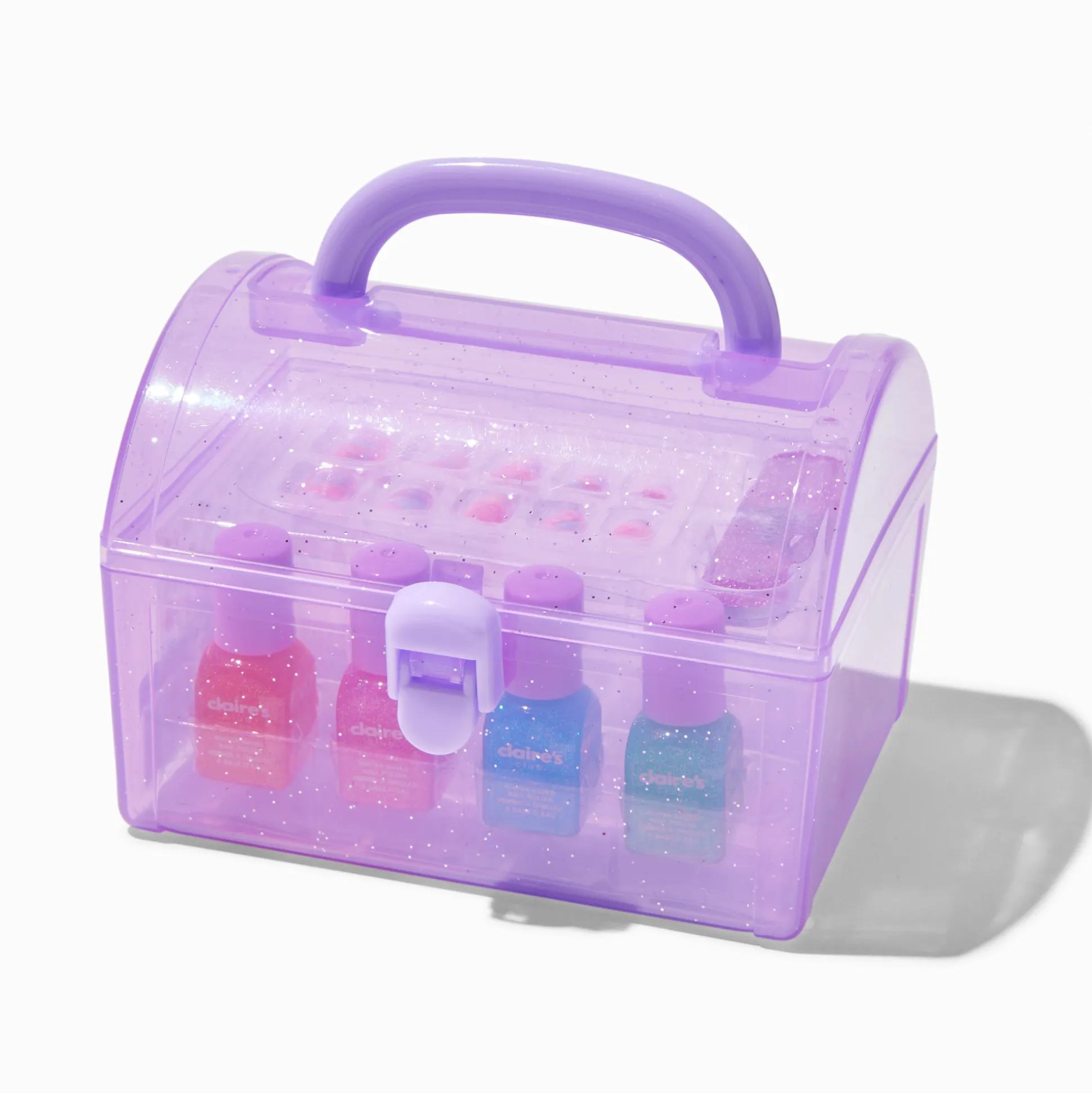 She can create pretty manicures with this nail kit treasure chest! Included are 4 nail polishes, a set of faux nails, nail stickers, a nail file, nail gems and nail adhesive.
