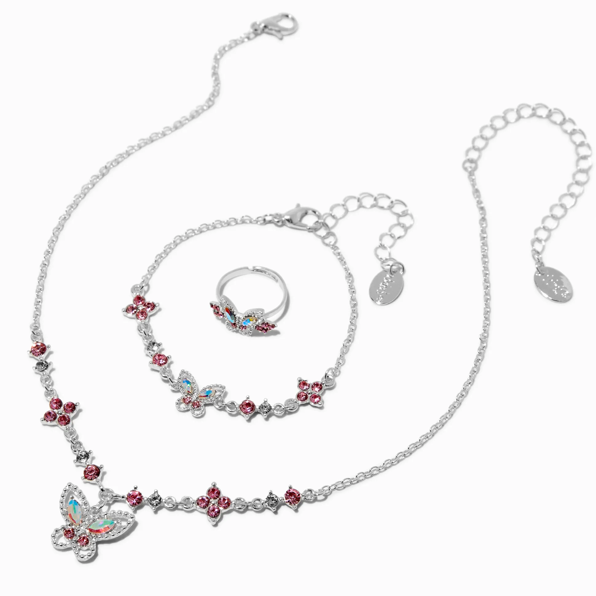 Give her a classic look in this charming jewellery set. It includes a necklace, bracelet, and adjustable ring. The silver-tone set is decorated with butterfly charms.