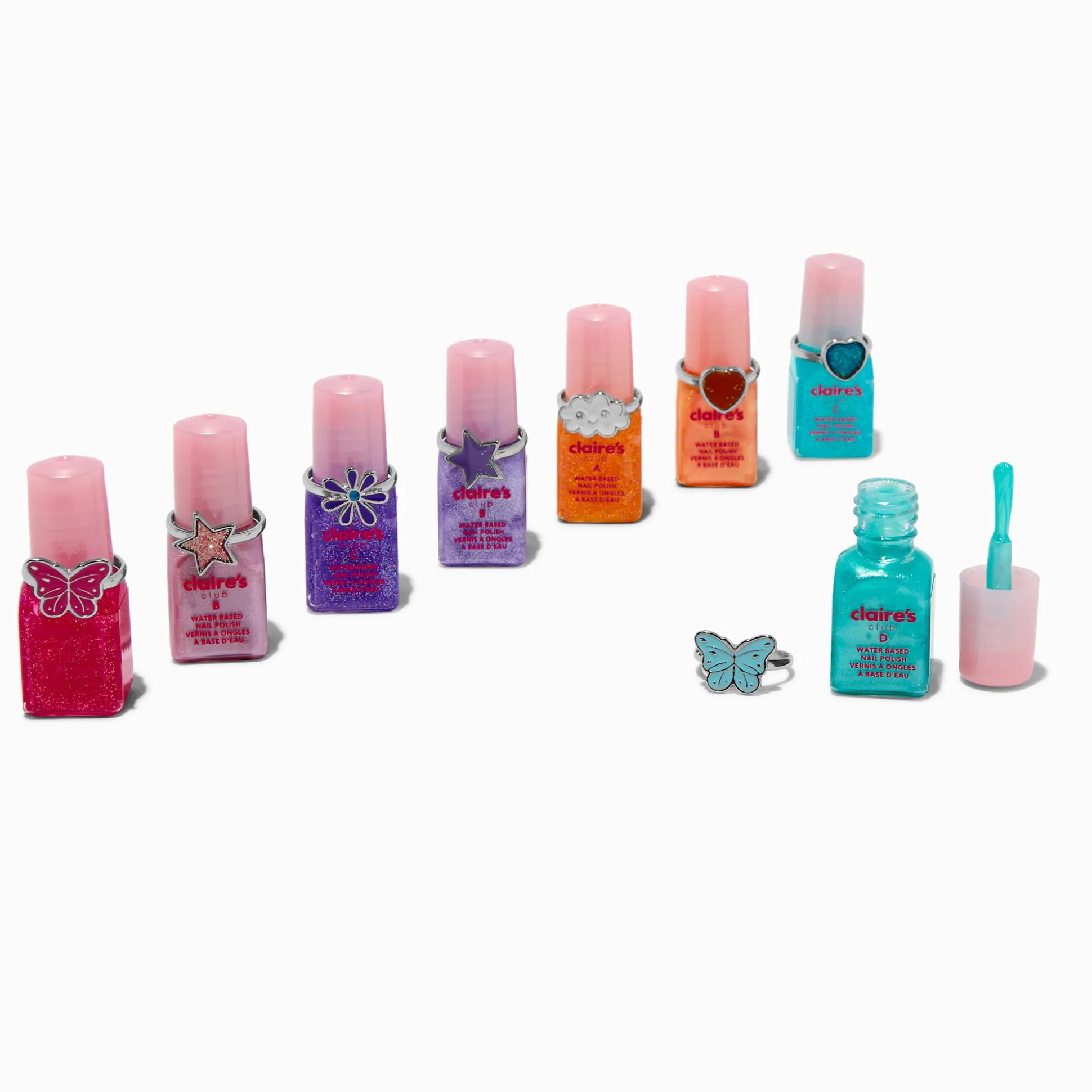 - Includes: 8 peel-off nail polishes, 8 adjustable rings