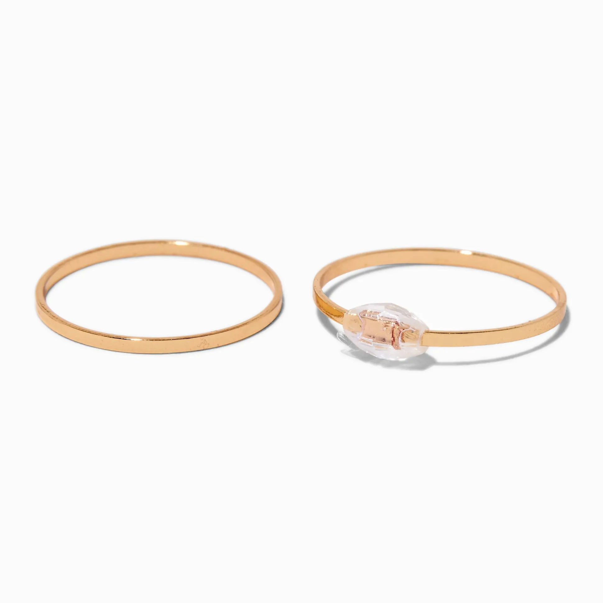 Decorate your hands with this simple but impactful ring stack. The two-pack gold-tone set has a plain band and one decorated with a faceted clear bead.