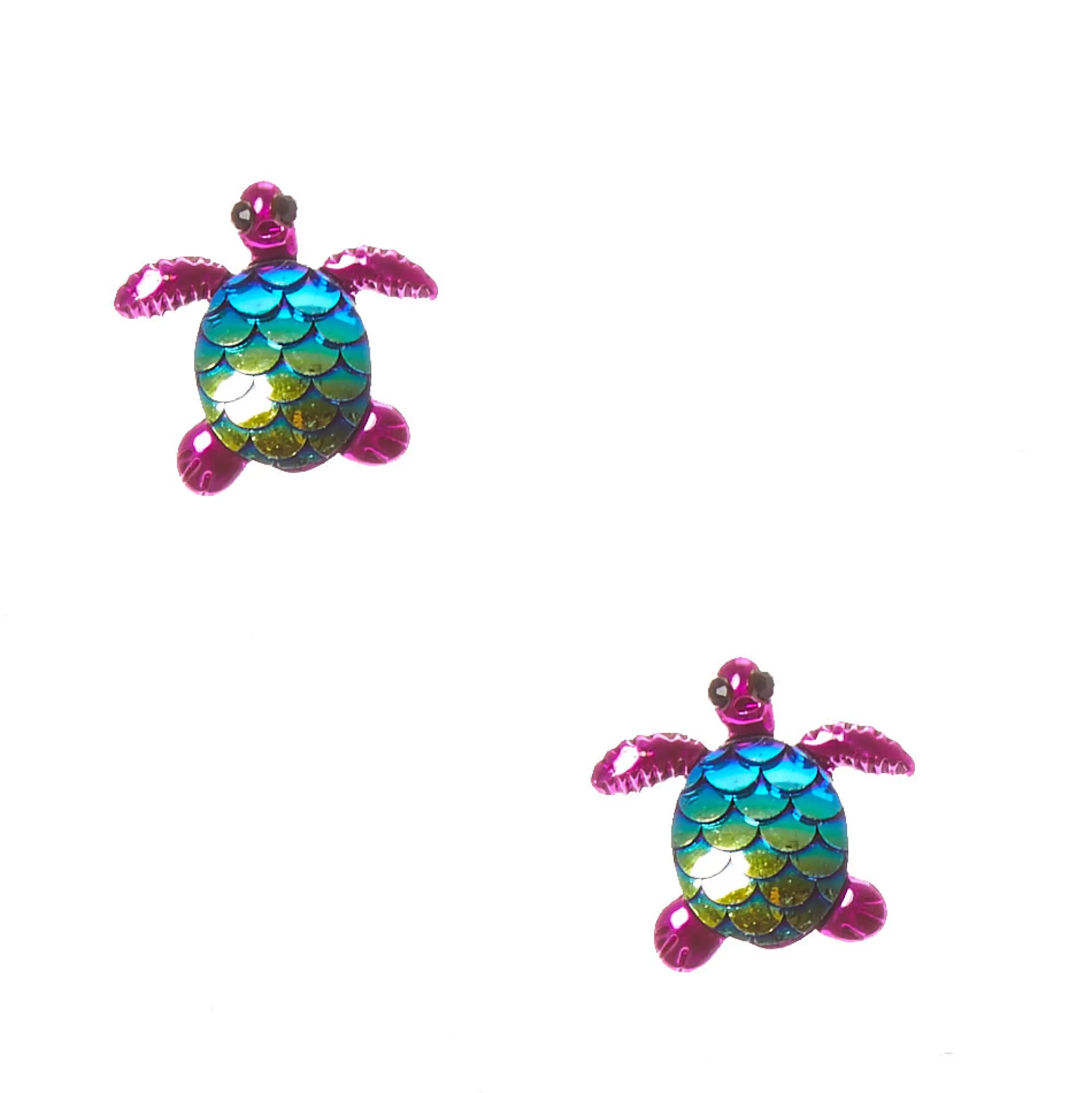Tu vas adorer te balader avec ces petites tortues suspendues à tes oreilles ! L’adorable tortue rose a des yeux en strass noirs et une carapace en écailles dans un dégradé de bleu holographique.