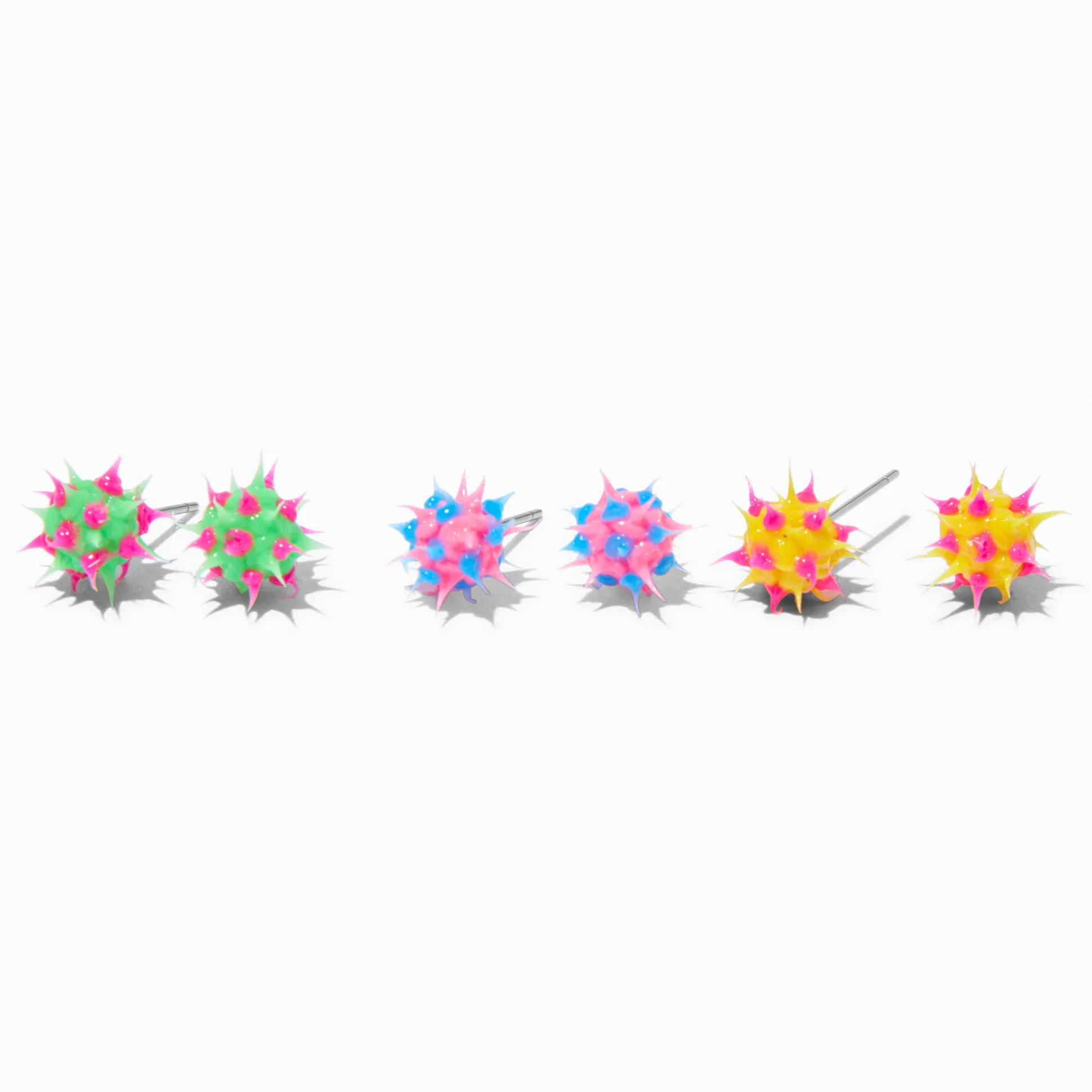 Avec leurs petites pointes fluo éclatantes, ces clous d’oreilles te feront dire WOW. Les trois paires affichent tes couleurs préférées, parfaites pour briller sous une lumière noire.
