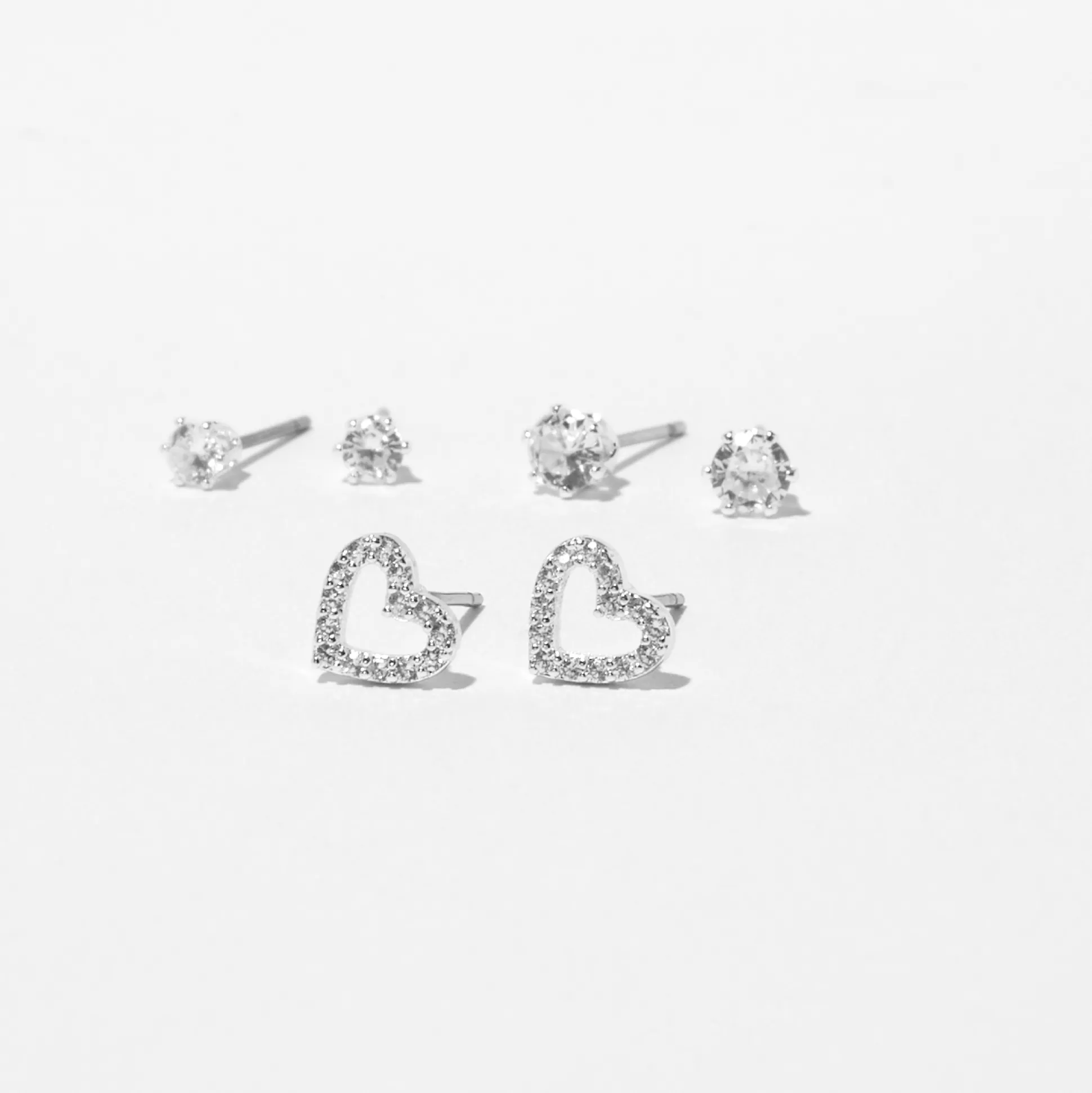 Rien ne bat une paire de clous en zircon cubique d’imitation brillants ! Ce lot de trois paires couleur argentée comprend des clous avec un contour de cœur et deux paires de clous de tailles différentes. Choisis la paire qui correspond à ton humeur.