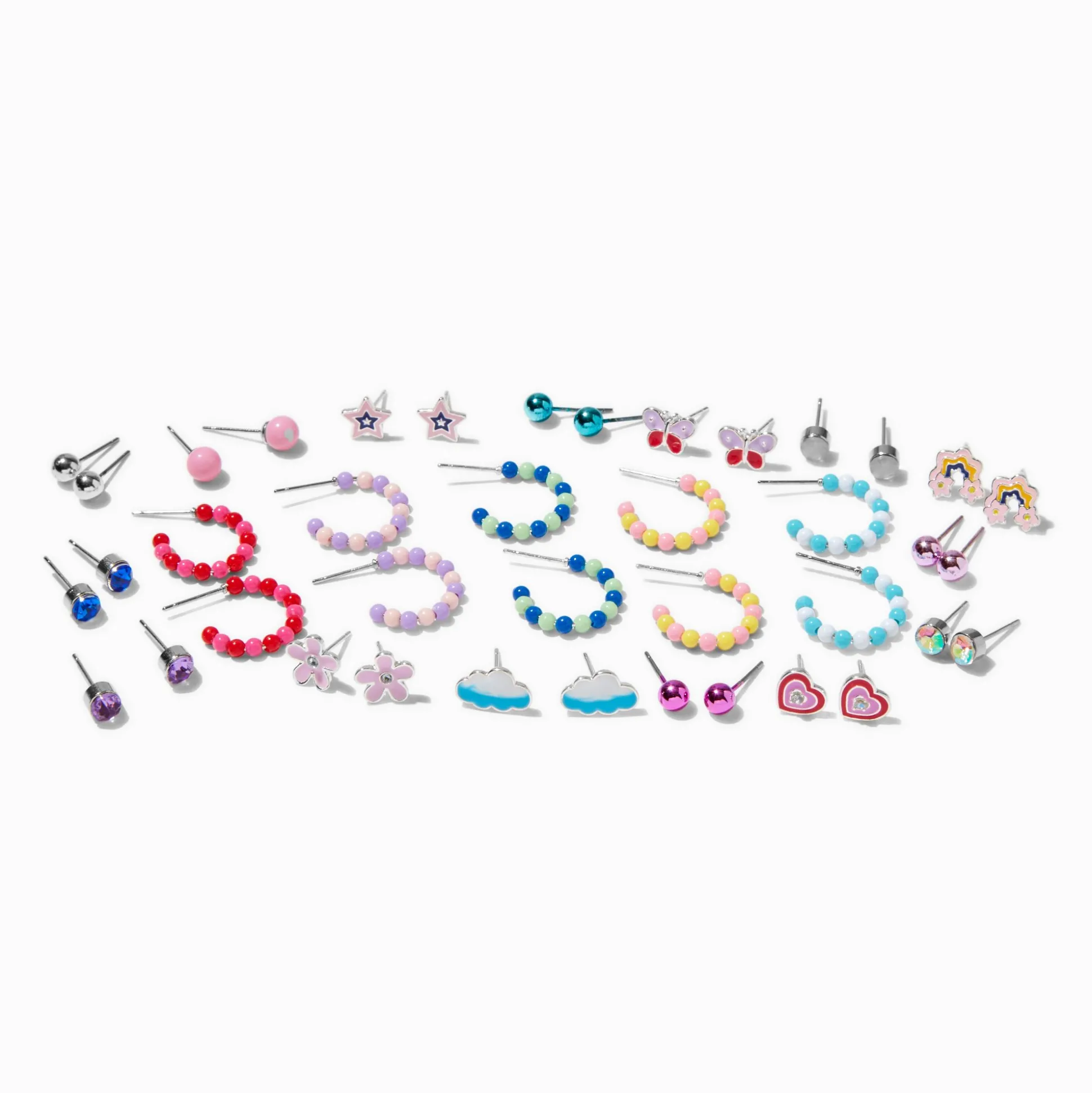 Aie toujours la paire de boucles d’oreilles parfaite avec ce lot aux designs nombreux et variés. Le lot de 20 comprend 15 paires de clous avec des arcs-en-ciel, des cœurs, des nuages etc. Le lot est complété par 5 paires de créoles huggies perlées. Fais du mix and match, ou si tu as plusieurs piercings, tu peux les superposer !